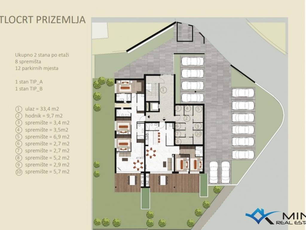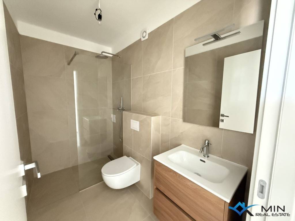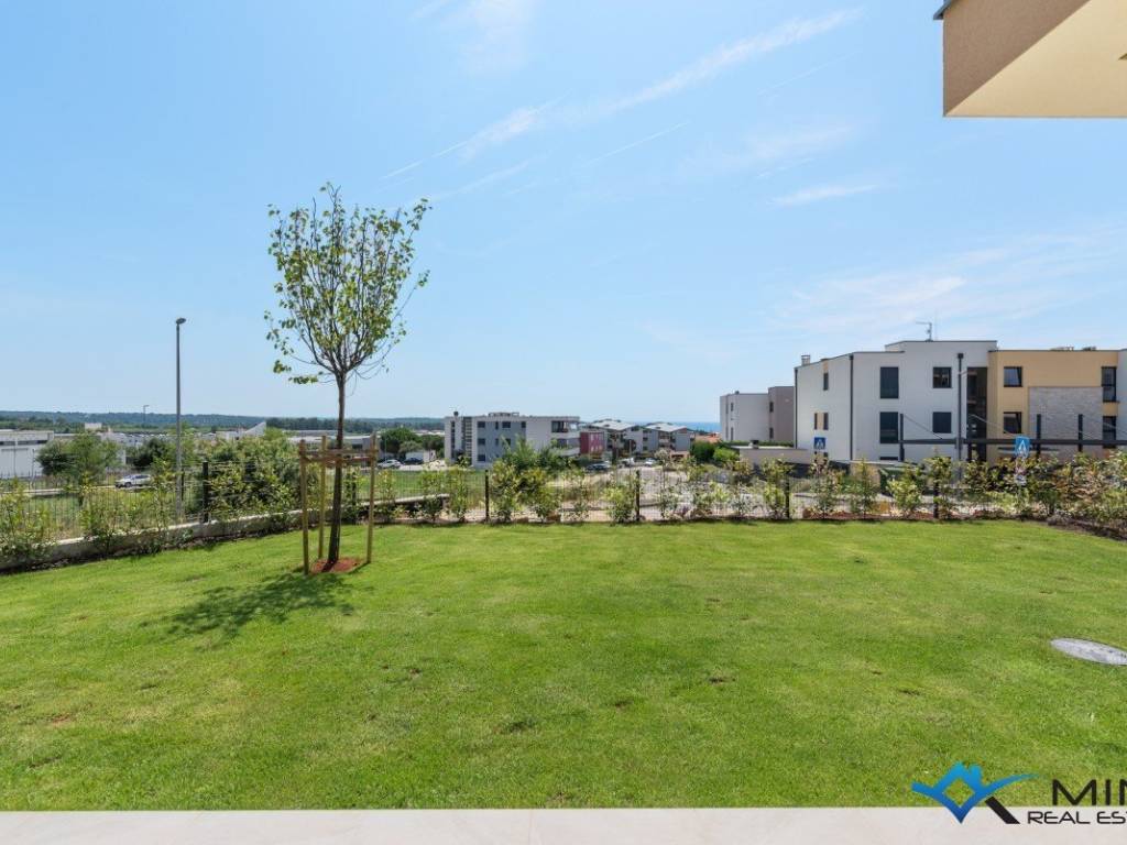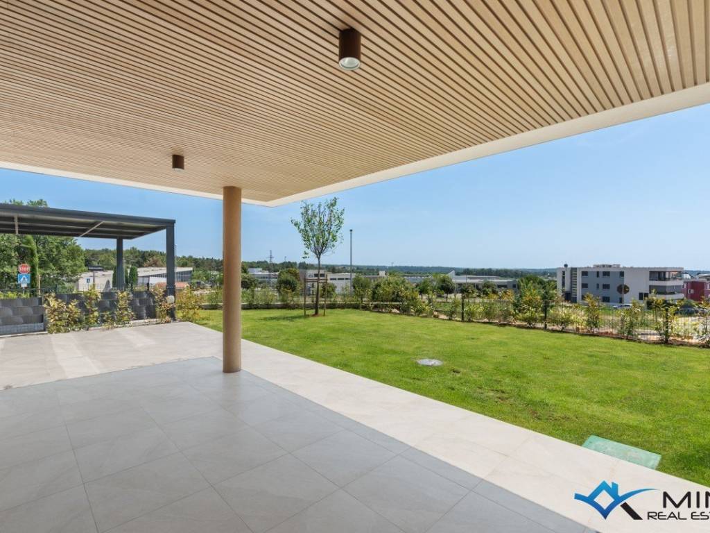 A luxurious apartment in a quality new building in Novigrad is for sale. The apartment is 900 m from the sea and a beautifully landscaped beach, and 1200 m from the city center. The apartment is located on the ground floor of the building, and the building has a total of 8 apartments. The apartment is equipped with electric underfloor heating, air conditioning and a fireplace. The apartment is equipped with 1st class ceramics, and the sanitary ware in the bathrooms are from well-known manufacturers. The apartment has 138m2, of which 98.50 m2 is the residential part (entrance hall, storage room, wardrobe, 3 bathrooms, 3 bedrooms, kitchen with dining room and living room. The apartment has a covered terrace of 23.30 m2 (net 11, 60 m2), garden of 186,30 m2 (net 18,63 m2), storage room of 3,50 m2 (net 2,63 m2) and 2 parking spaces of 25 m2 (net 5 m2). The apartment can be used in residential or tourist purposes.
