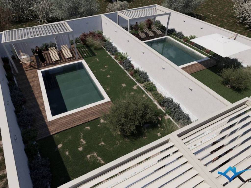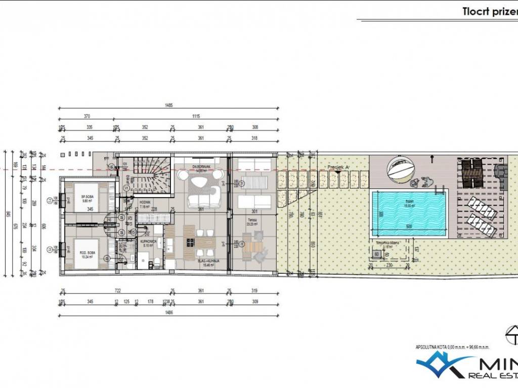 An apartment on the ground floor of the building is for sale in a quiet location in Tar, only 200 m from the city center. The apartment has a total of 96 m2 - apartment 64 m2 + terrace 23, 23 (0.5 11, 61 m2) + swimming pool 15 m2 + yard 139 m2 (0.1 13, 90 m2) + 2 parking spaces 25 m2 (0 , 5 12.5 m2). The apartment consists of a hallway, 2 bathrooms, 2 bedrooms and an open space area where there is a kitchen with a dining room and a living room with access to the terrace and garden of 139 m2. The apartment can be used for residential or tourist purposes.