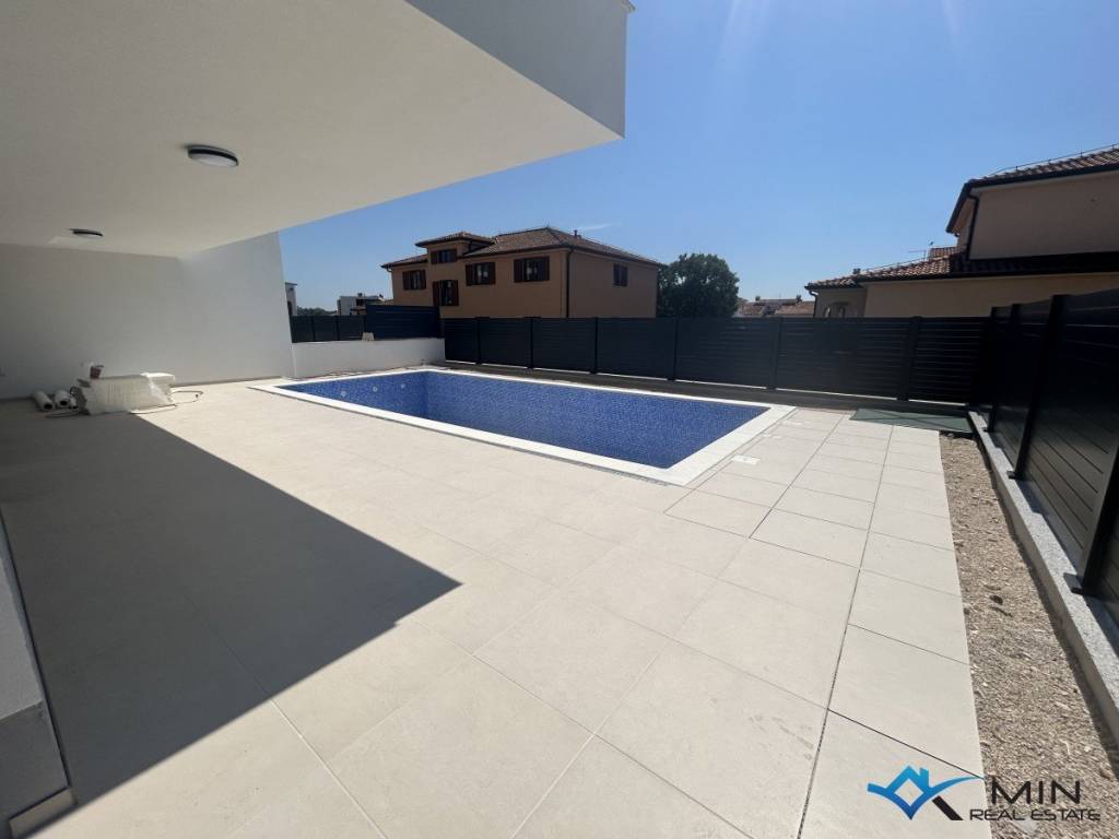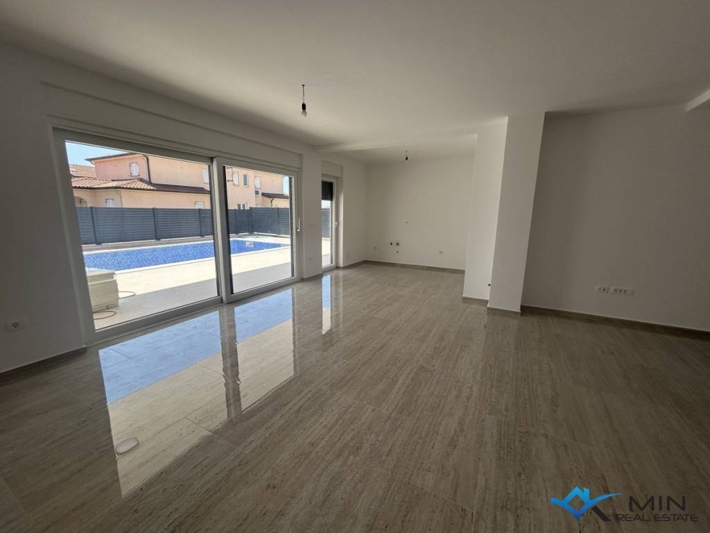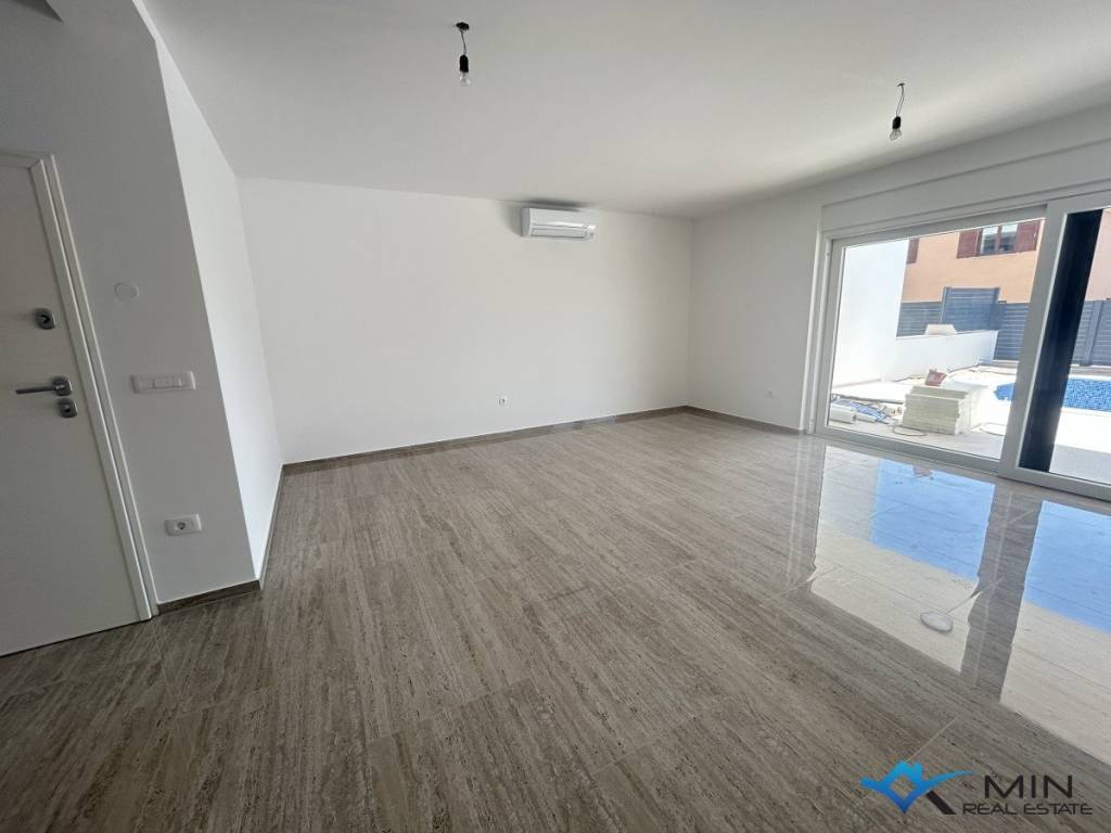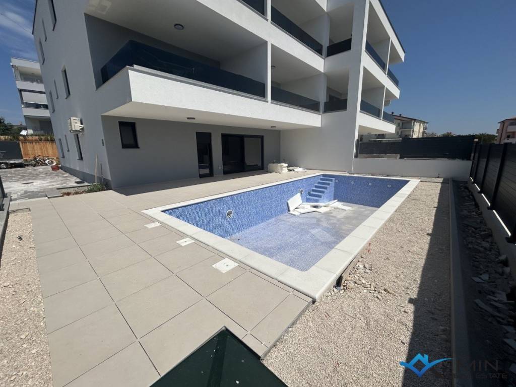 An apartment for sale in a highly sought-after location in Novigrad. The apartment is located on the ground floor of a building with a total of 8 apartments. The apartment is 123 m2 and consists of an entrance hall, 2 bathrooms, 3 bedrooms and an open space area where there is a kitchen with a dining room and a living room with access to the loggia, a garden and a private pool of 36 m2. Heating and cooling in the apartment is via underfloor heating in the bathroom, air conditioning and a chimney, so there is a possibility of installing a fireplace or pellet stove. The apartment has 2 parking spaces. The apartment can be used for residential purposes. The distance from the sea and the beautifully decorated beach is 800 m, and the center of Novigrad is 1000 m away.