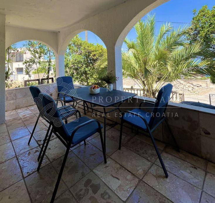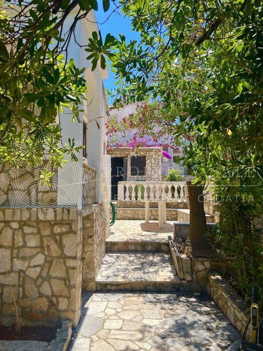 It offers a sea view from the terrace. The land plot measures 190 m2 and house about 100 m2 with a terrace, bedroom, bathroom, kitchen, and summer kitchen. The house has a complete project for building one more floor and renovating. House is surrounded with greenery.
