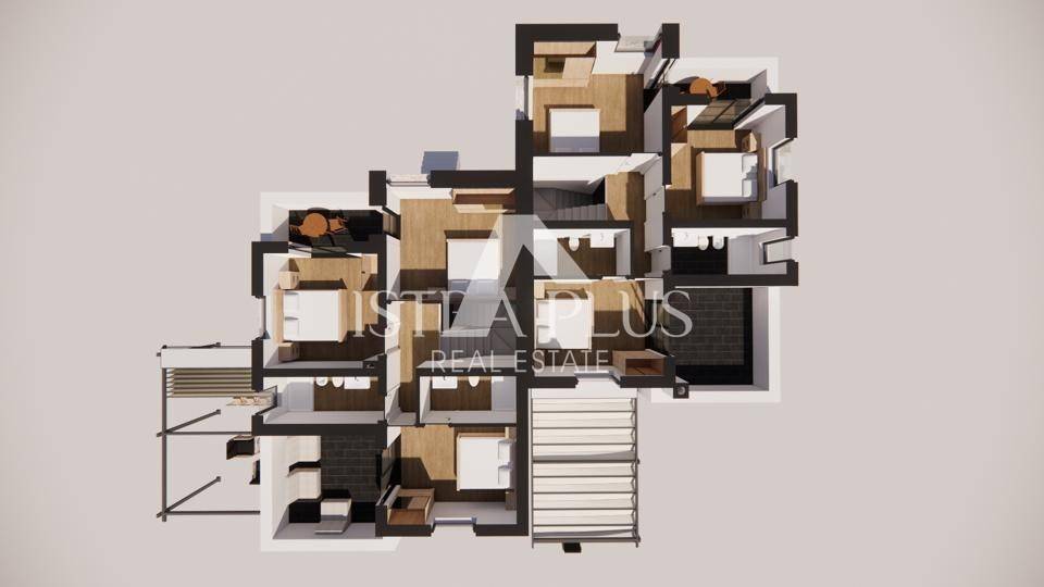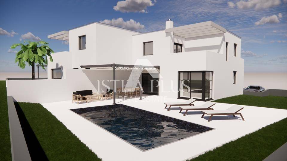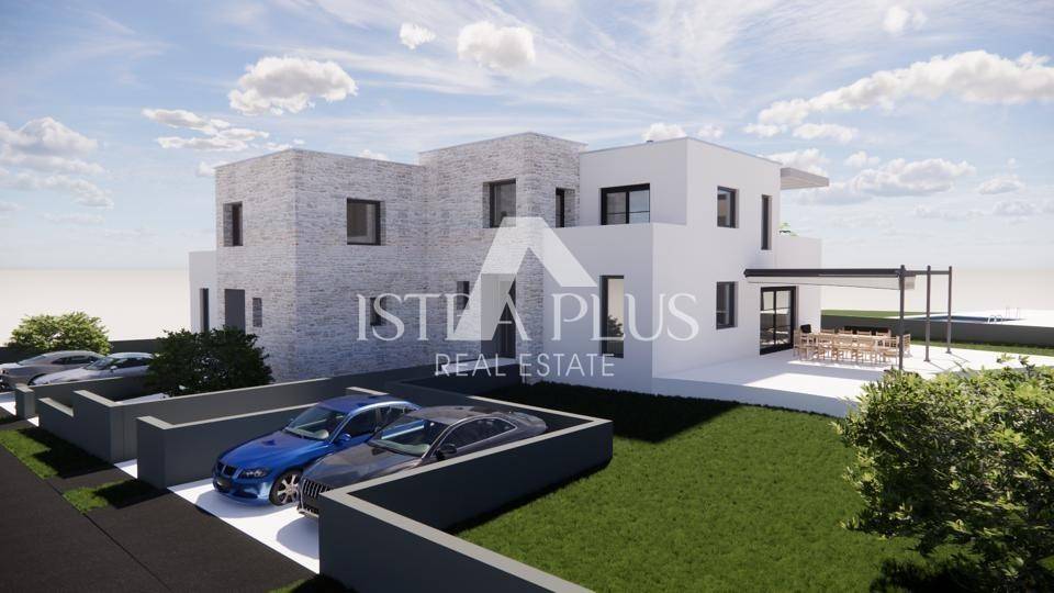 K42 Semi-detached houses for sale on the edge of a quiet village 8 km from Poreč. Construction is planned to begin at the end of 2022, and to be completed in the fall of 2023. The house has an area of 150 m2 on a plot of 520 m2. Heating and cooling will be according to the principle - Split Invert Klima -, if the customer wants heating - heat pumps - then the price changes. Given that it is a new building, the buyer has the option of making changes according to his own needs and wishes. The house is sold turnkey. The ground floor consists of a bedroom with a bathroom, a guest toilet, a storage room, a living room, a kitchen with access to a covered terrace and a yard with a swimming pool. On the first floor there are three bedrooms, two bathrooms, a balcony and a terrace. Two parking spaces in front of the house.