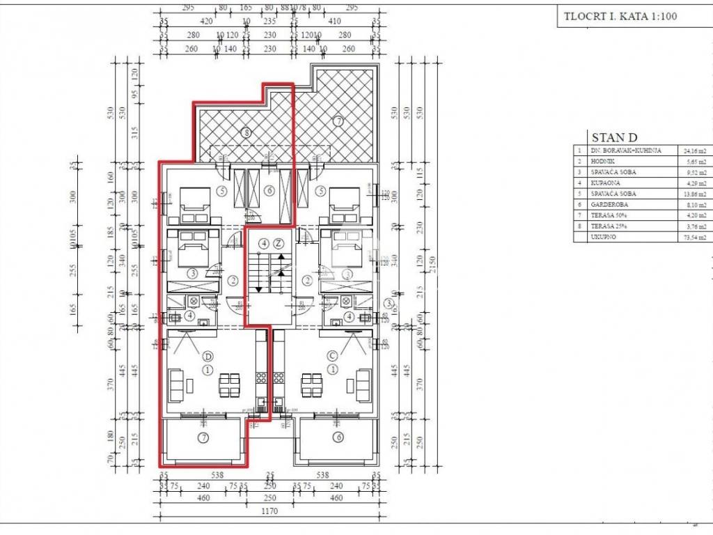 For sale is an apartment on the 1st floor of the building of 73.54 m2, consisting of a hallway, living room with kitchen and dining room, two bedrooms, one with its own wardrobe, bathroom and two terraces.