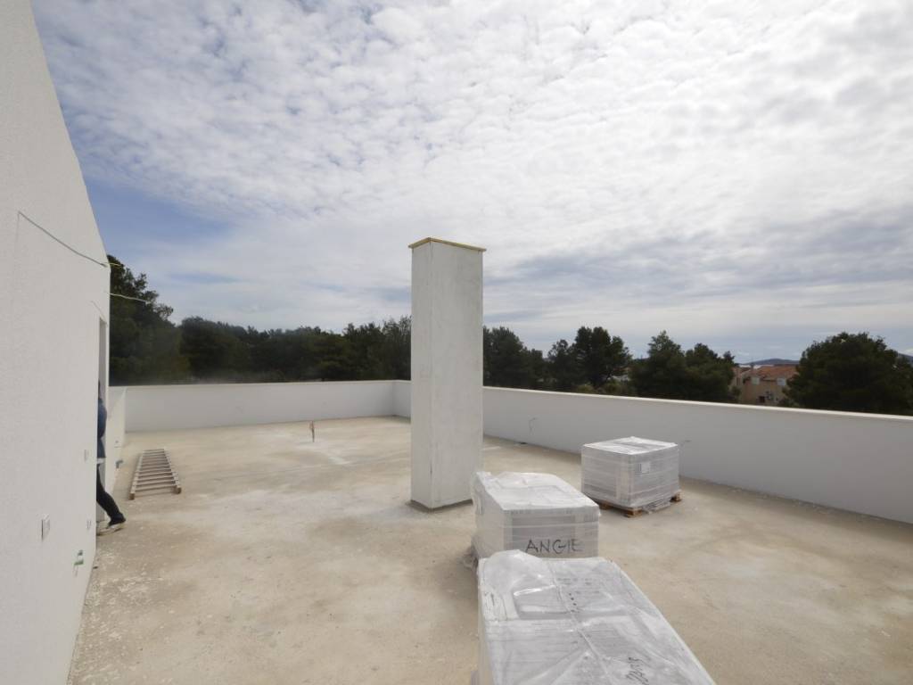 New build on 629m plot, with heat pump, pool and rooftop terrace prepped for jacuzzi or outdoor kitchen. Newly Built House with Pool & Rooftop Terrace Peaceful Location Near Vodice Center For sale: a modern, newly constructed house located in a quiet residential area of Vodice, just 850 meters from the town center and the sea.