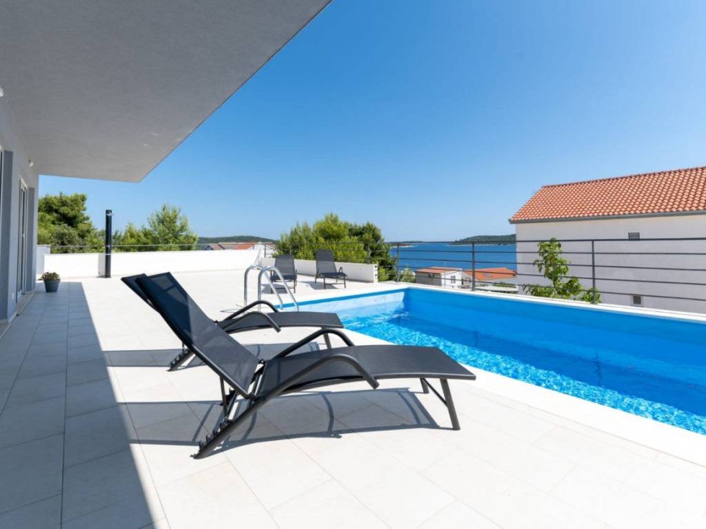 Swimming pool and sunbathing area with sea views and surrounding nature.