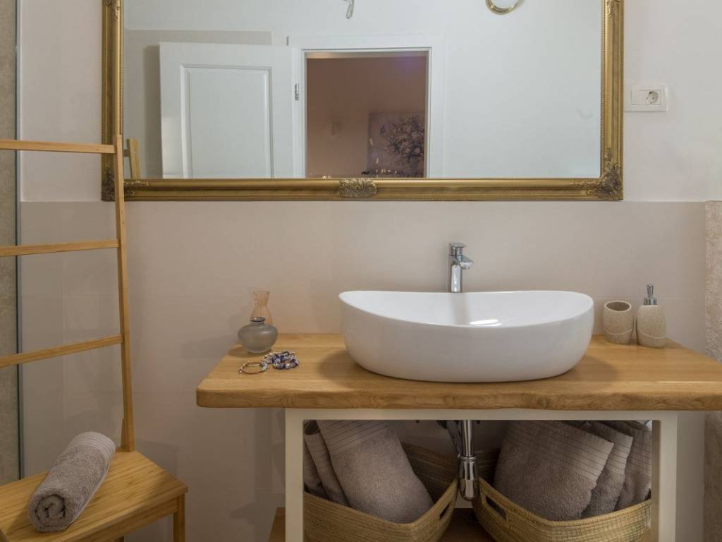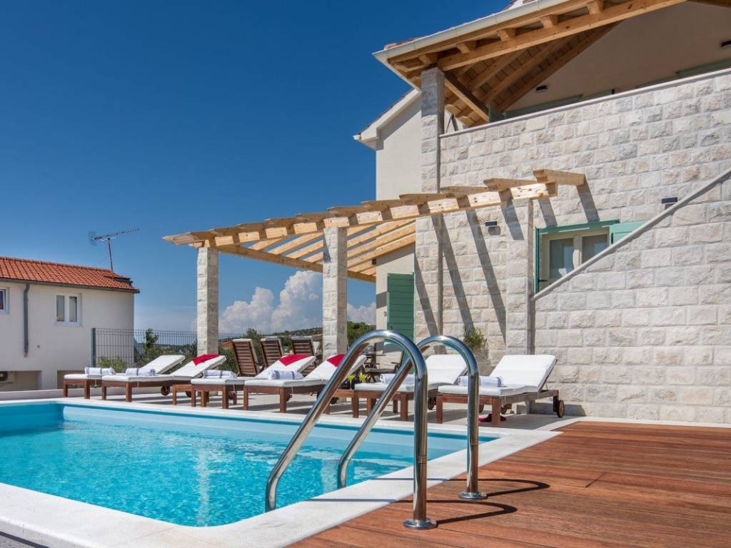 Internal stairs lead to the first floor, which consists of three bedrooms, each with its own bathroom, while two rooms have access to a beautiful terrace with a view of the sea and Primošten.