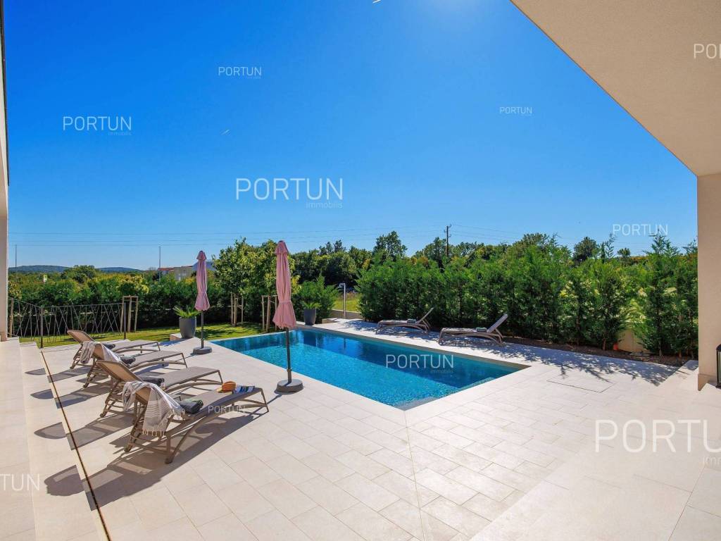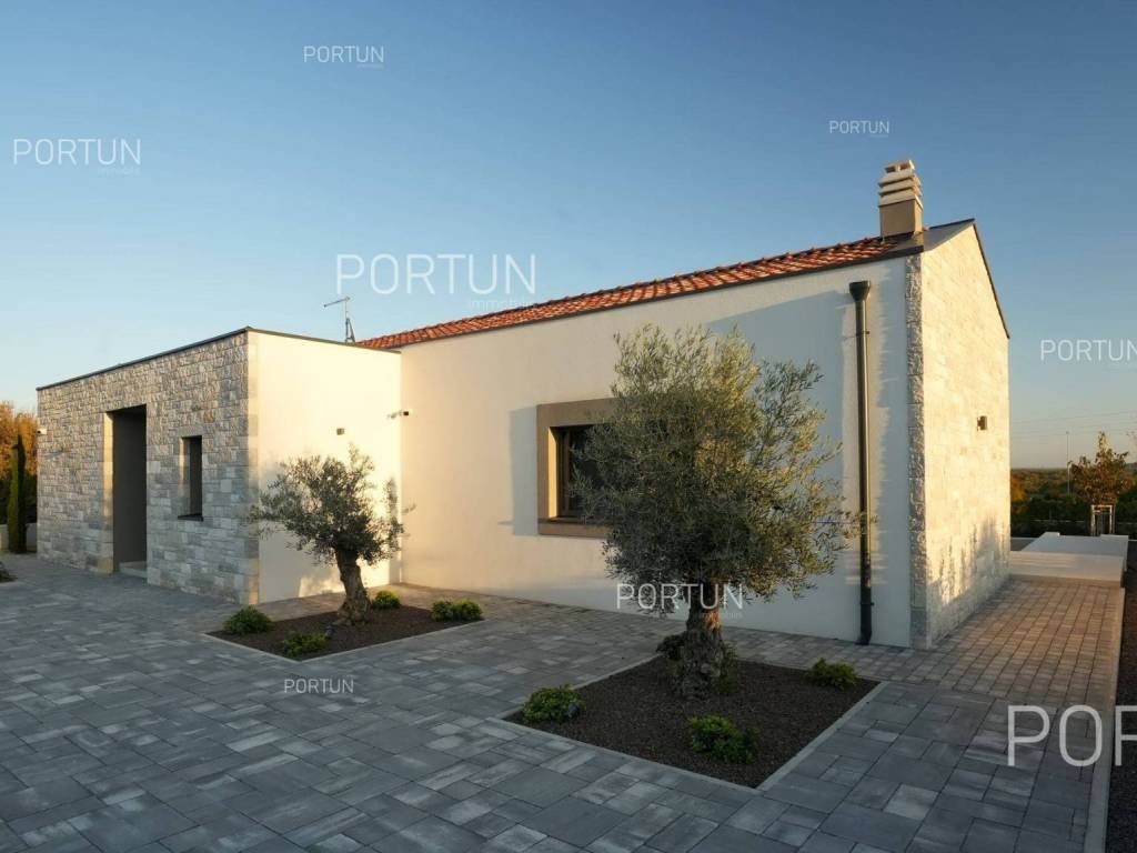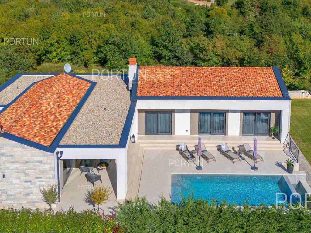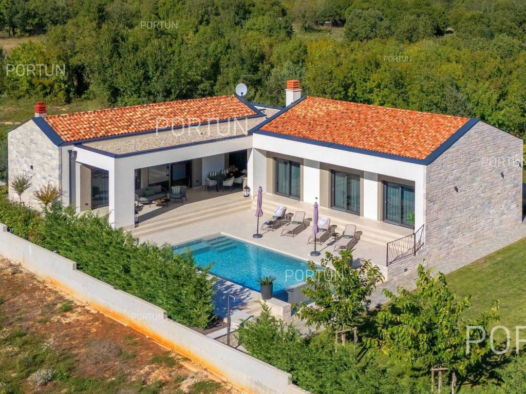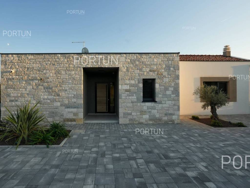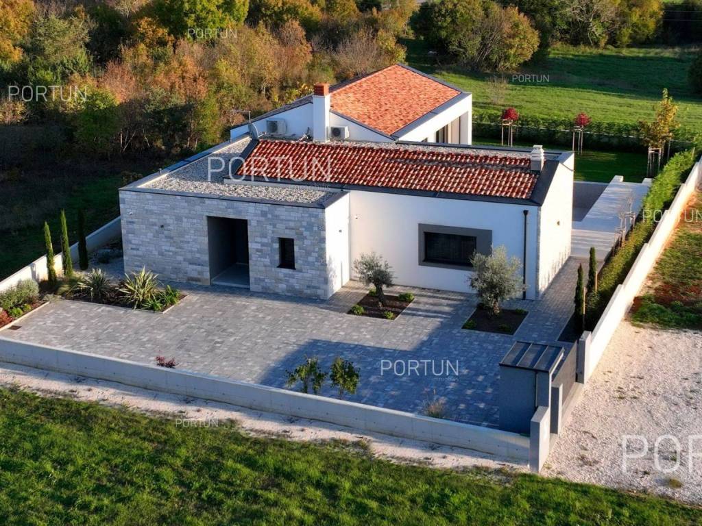 It features three spacious bedrooms, a lush garden, and a large terrace with an infinity pool. Designed with meticulous attention to detail, the villa impresses with its generous covered terrace equipped with a summer kitchen, sophisticated design elements, and walls adorned with natural stone cladding. The three bedrooms are situated in the south wing of the house, each with its own en-suite bathroom and direct access to the terrace, ensuring privacy and comfort. The west wing features an open-concept living room, dining area, and kitchen, forming a bright and airy space thanks to large glass openings that connect the interior with the exterior. The pool terrace is oriented to the south and west, offering ample sunlight throughout the day. The infinity pool, measuring 40 m, is surrounded by a sunbathing area, while the covered part of the terrace with a summer kitchen provides an ideal space for outdoor relaxation and gatherings. The garden is thoughtfully landscaped with a variety of vegetation, including hedges and deciduous trees, which will mature over time to create lush greenery and pleasant shade on the lawn. This newly built villa is equipped with underfloor heating powered by a heat pump and air conditioning, ensuring year-round comfort. The price includes some of the furniture shown in the photos, with the option to negotiate the purchase of additional pieces. This villa is an excellent opportunity for a peaceful retreat or a luxury property investment near one of Istria's most sought-after destinations. LocationIstria represents an ideal combination of crystal clear sea, hills and valleys, playful rivers and waterfalls, sun-drenched vineyards and numerous historical and cultural sights. Known as the pearl of the Istrian peninsula, Rovinj is the champion of Croatian tourism, teeming with life in the summer and peace in the winter, colored by the magical colors of the sunset and the charming old town center enriched with Venetian architecture. Sea | Beach 11 km Services | Food store 5 km - Cafe or bar 5 km - Elementary School 5 km - Kindergarten 5 km - Pharmacy 5 km Sports and fun | Soccer field 5 km Nearby towns | Bale 10 km Traffic | Nearest highway entry 2 km Attractions | Abandoned medieval town Dvigrad 8 km About the propertyThe estate which extends to 1.184 square meters comprises: House | 209,00 m2Swimming pool | 40,00 m2LayoutThe entrance to the house is on the ground floor. The modernly decorated house with an open layout, with 209 square meters features a living room with a kitchen and a dining room, three bedrooms with bathrooms, a covered terrace, one toilet, a covered entrance, one boiler room and one storage room for bicycles. Extras Parking for four carsAbout the houseThe entrance to the house is from the northwest side. The basic architectural characteristics of this modern holiday home are: Floors | Ground floor Orientation | Southwest External walls | Stone wall 15 cm + Styrofoam insulation 10 cm + Block brick wall 25 cm Concrete slab floors Roof | Pitched roof covered with clay tiles Built in 2024Furniture and equipmentFurniture | Modern furnitureEquipment | Video intercom - Alarm system for the house - Video surveillanceJoinery | PVC joinery with double glazing - Lift & Slide system - Security aluminum entry door - Interior doors made of solid woodMultimedia | TV in the living room - TV in each bedroom - SAT TVHeating and cooling | Underfloor heating with a heat pump - Air conditioning - Heat pumps Daikin - Combined water boilerFlooring | Top quality ceramic tilesOutdoor spaceEquipment | Outdoor lighting - Automatic irrigation - Drip irrigationFences | Concrete wallDriveway | Motor drive - Slide opening - Video intercomPedestrian entrance | Metal doorOutdoor poolOverflow pool 40,00 m2 | Concrete construction - Pool liner: Ceramic tiles - Salt water (disinfection by chlorine electrolysis) - Water heating installations Services Connection to the power grid | 9,6 kW Connection to the water supply network Biological waste water purifier Distance to the paved road 100 mArea calculationThe area of the house (209,05 m2) includes the areas of these spaces:Living area = 175,97 m2 x 1,00 = 175,97 m2*Covered terrace = 52,61 m2 x 0,50 = 26,31 m2**Storage space = 6,77 m2 x 1,00 = 6,77 m2**Areas are calculated with coefficient c= 1,00**Areas are calculated with coefficient c= 0,50Data source = ProjectThe total land area including the footprint of the building(s) amounts to 1.184 square meters. Data source = Cadastre data