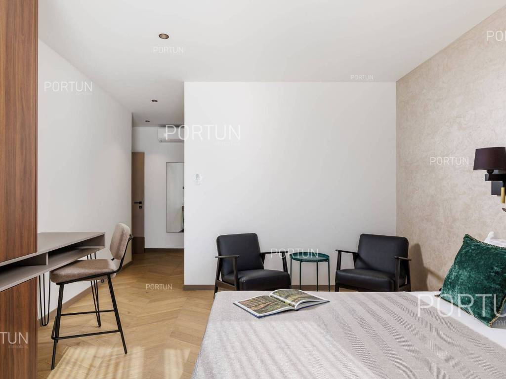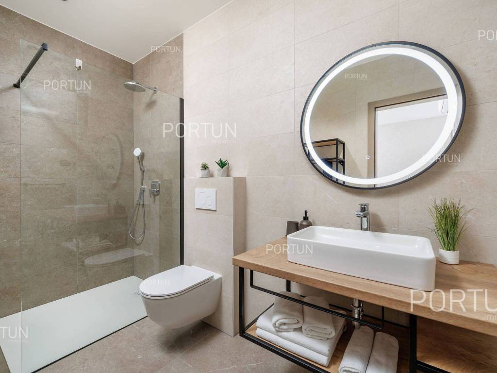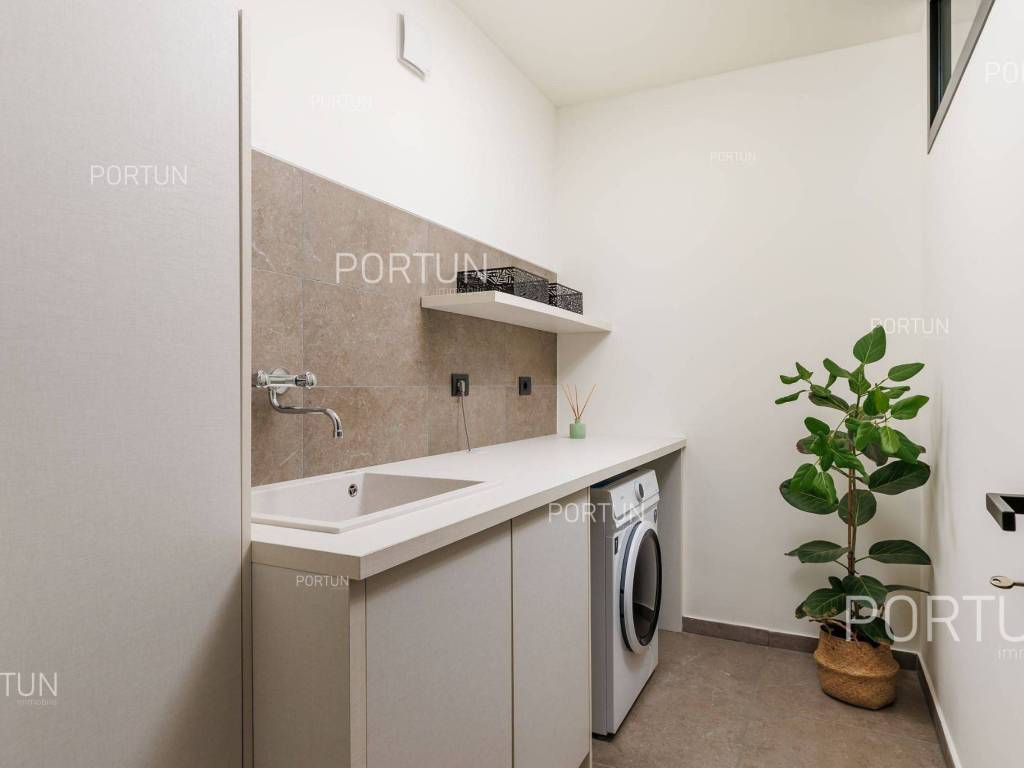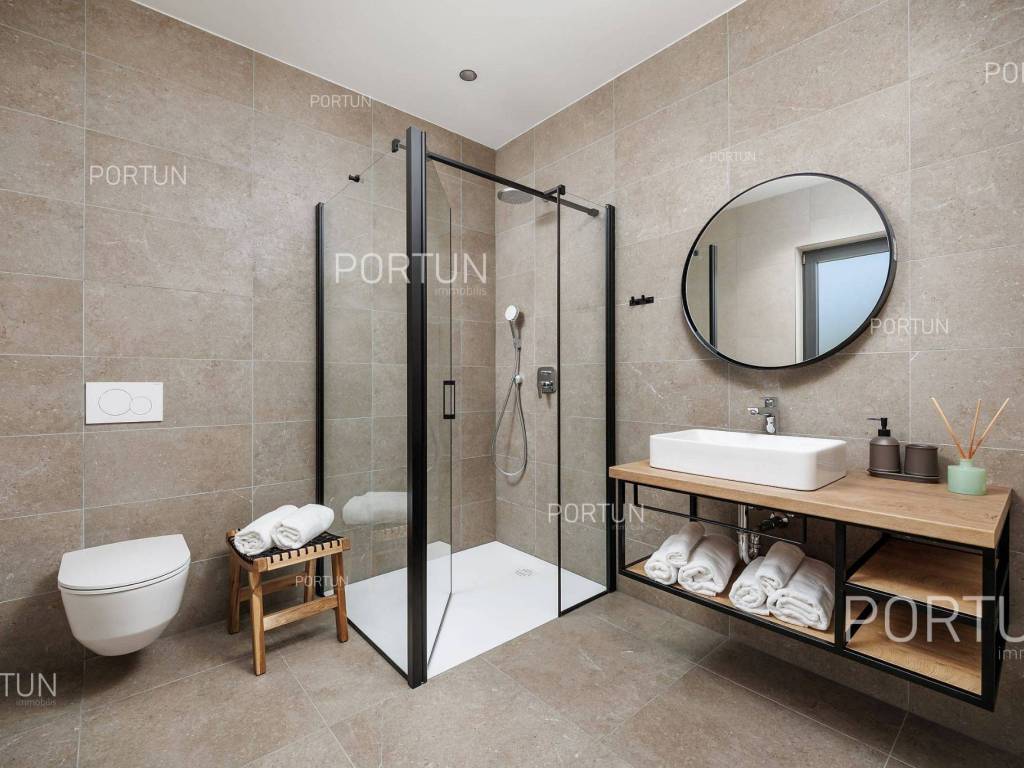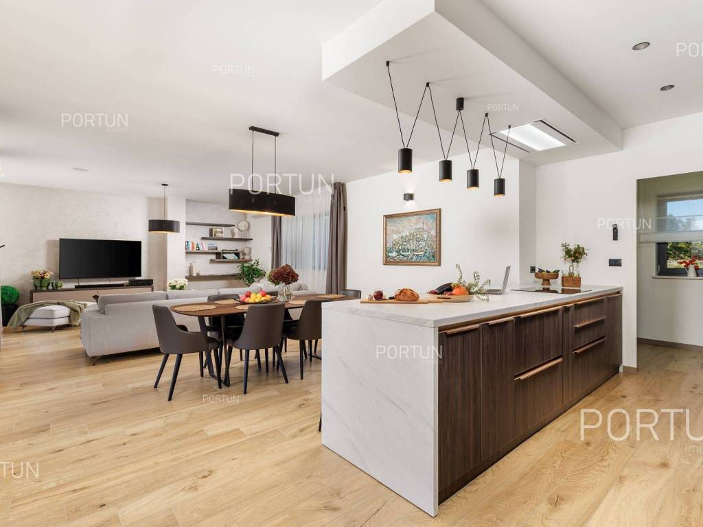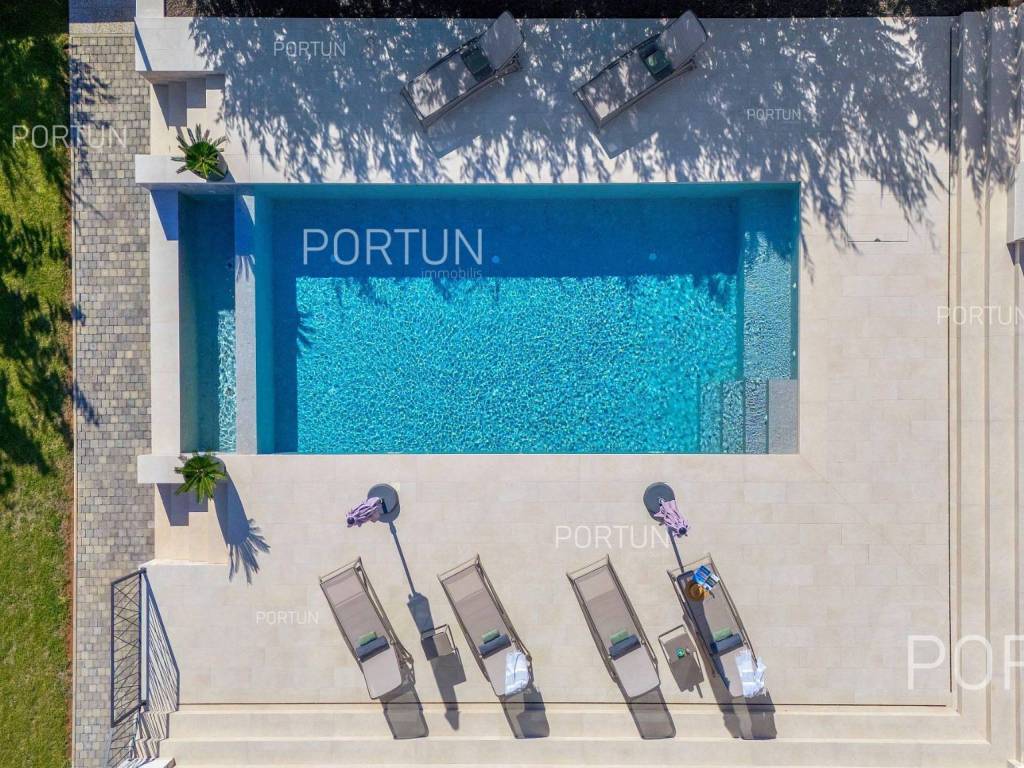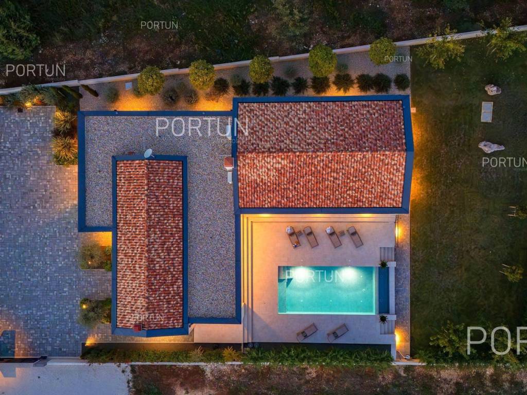 It features three spacious bedrooms, a lush garden, and a large terrace with an infinity pool. Designed with meticulous attention to detail, the villa impresses with its generous covered terrace equipped with a summer kitchen, sophisticated design elements, and walls adorned with natural stone cladding. The three bedrooms are situated in the south wing of the house, each with its own en-suite bathroom and direct access to the terrace, ensuring privacy and comfort. The west wing features an open-concept living room, dining area, and kitchen, forming a bright and airy space thanks to large glass openings that connect the interior with the exterior. The pool terrace is oriented to the south and west, offering ample sunlight throughout the day. The infinity pool, measuring 40 m, is surrounded by a sunbathing area, while the covered part of the terrace with a summer kitchen provides an ideal space for outdoor relaxation and gatherings. The garden is thoughtfully landscaped with a variety of vegetation, including hedges and deciduous trees, which will mature over time to create lush greenery and pleasant shade on the lawn. This newly built villa is equipped with underfloor heating powered by a heat pump and air conditioning, ensuring year-round comfort. The price includes some of the furniture shown in the photos, with the option to negotiate the purchase of additional pieces. This villa is an excellent opportunity for a peaceful retreat or a luxury property investment near one of Istria's most sought-after destinations. LocationIstria represents an ideal combination of crystal clear sea, hills and valleys, playful rivers and waterfalls, sun-drenched vineyards and numerous historical and cultural sights. Known as the pearl of the Istrian peninsula, Rovinj is the champion of Croatian tourism, teeming with life in the summer and peace in the winter, colored by the magical colors of the sunset and the charming old town center enriched with Venetian architecture. Sea | Beach 11 km Services | Food store 5 km - Cafe or bar 5 km - Elementary School 5 km - Kindergarten 5 km - Pharmacy 5 km Sports and fun | Soccer field 5 km Nearby towns | Bale 10 km Traffic | Nearest highway entry 2 km Attractions | Abandoned medieval town Dvigrad 8 km About the propertyThe estate which extends to 1.184 square meters comprises: House | 209,00 m2Swimming pool | 40,00 m2LayoutThe entrance to the house is on the ground floor. The modernly decorated house with an open layout, with 209 square meters features a living room with a kitchen and a dining room, three bedrooms with bathrooms, a covered terrace, one toilet, a covered entrance, one boiler room and one storage room for bicycles. Extras Parking for four carsAbout the houseThe entrance to the house is from the northwest side. The basic architectural characteristics of this modern holiday home are: Floors | Ground floor Orientation | Southwest External walls | Stone wall 15 cm + Styrofoam insulation 10 cm + Block brick wall 25 cm Concrete slab floors Roof | Pitched roof covered with clay tiles Built in 2024Furniture and equipmentFurniture | Modern furnitureEquipment | Video intercom - Alarm system for the house - Video surveillanceJoinery | PVC joinery with double glazing - Lift & Slide system - Security aluminum entry door - Interior doors made of solid woodMultimedia | TV in the living room - TV in each bedroom - SAT TVHeating and cooling | Underfloor heating with a heat pump - Air conditioning - Heat pumps Daikin - Combined water boilerFlooring | Top quality ceramic tilesOutdoor spaceEquipment | Outdoor lighting - Automatic irrigation - Drip irrigationFences | Concrete wallDriveway | Motor drive - Slide opening - Video intercomPedestrian entrance | Metal doorOutdoor poolOverflow pool 40,00 m2 | Concrete construction - Pool liner: Ceramic tiles - Salt water (disinfection by chlorine electrolysis) - Water heating installations Services Connection to the power grid | 9,6 kW Connection to the water supply network Biological waste water purifier Distance to the paved road 100 mArea calculationThe area of the house (209,05 m2) includes the areas of these spaces:Living area = 175,97 m2 x 1,00 = 175,97 m2*Covered terrace = 52,61 m2 x 0,50 = 26,31 m2**Storage space = 6,77 m2 x 1,00 = 6,77 m2**Areas are calculated with coefficient c= 1,00**Areas are calculated with coefficient c= 0,50Data source = ProjectThe total land area including the footprint of the building(s) amounts to 1.184 square meters. Data source = Cadastre data