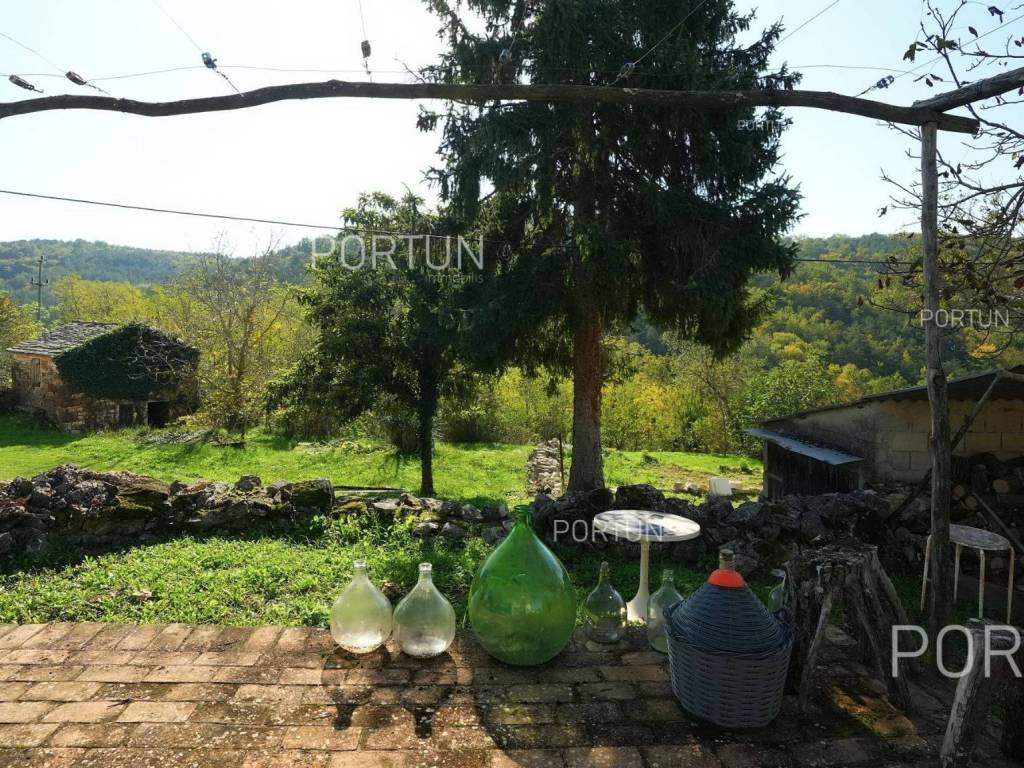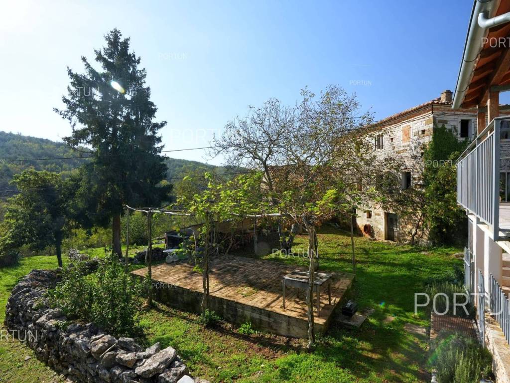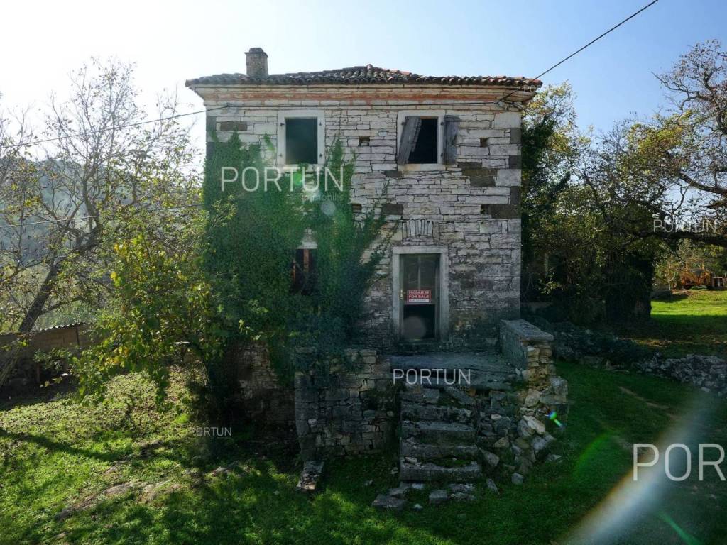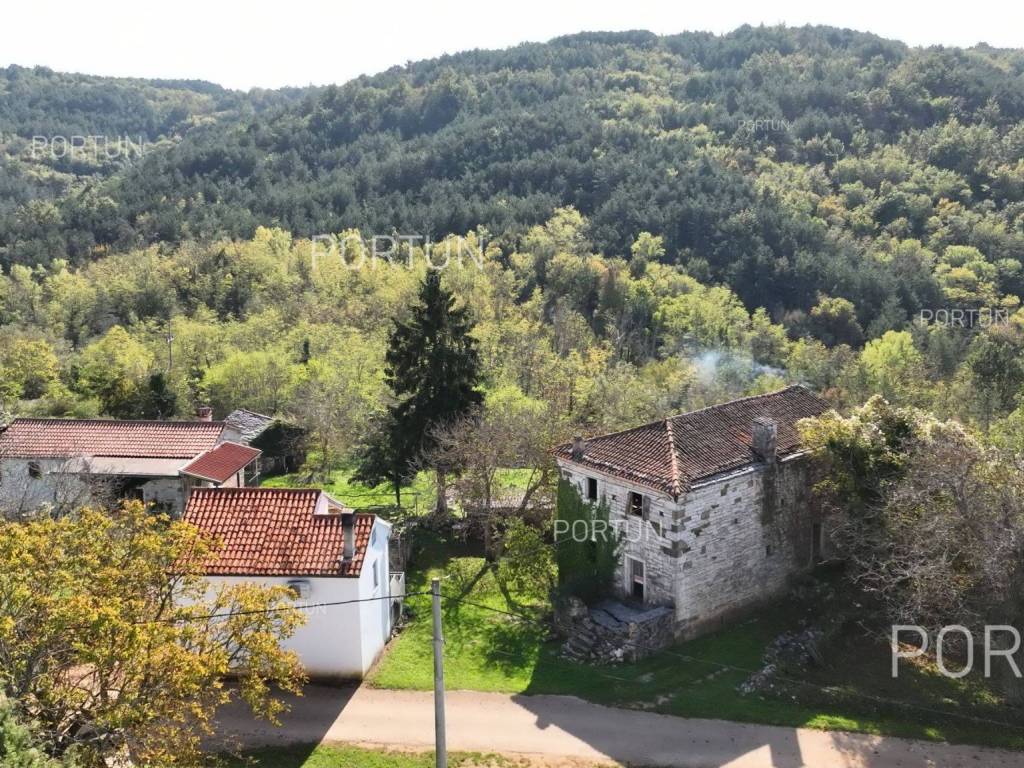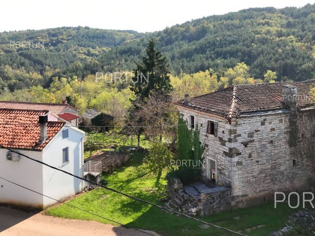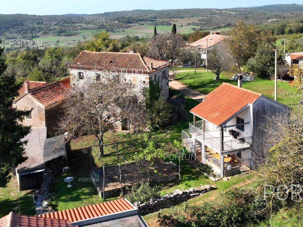 In this idyllic location, in a quiet village not far from Oprtalj, there is a property with two houses and a yard, perfect for those looking for peace and a wonderful view. The houses are located on the southwest slope, with an open view of wooded hills and meadows. In this location you can enjoy peace and quiet, because there are only a few rural houses in the area. The property is only a few minutes' drive from Oprtalj and Grožnjan, beautiful parts of Istria, famous for Parenzana and excellent inns offering local truffles. There are two houses on the estate. The larger house is completely abandoned and needs renovation. It originally had three floors, and the external dimensions are approximately 13 x 6 m. The smaller house was thoroughly renovated and modernized about 20 years ago and was subsequently legalized. It consists of two residential floors and an attic, with a total of 63 m of usable area. The bedroom and living room are on the first floor, while the bathroom, kitchen and dining room are on the ground floor. On each floor there is one large covered terrace facing south. An integral part of the property is an additional yard on the other side of the street, with an area of 737 m, where a parking lot, garden or swimming pool can be arranged. The ideal location offers an opportunity to build your own cottage or holiday home - the proximity of Grožnjan, Oprtlje and Parenzana are strong arguments in favor of this special property. LocationOne of the most developed and beautiful regions of Croatia is green-blue Istria, known as the "new Tuscany", which represents a combination of unique natural sights and rich cultural heritage. Quiet location in northern Istria, where the house is positioned, offers numerous amenities:Sea | Beach 27 km Services | Inn or restaurant 3 km - Elementary School 3 km Sports and fun | Thermal spa Istarske toplice 12 km Nearby towns | Grožnjan 12 km - Novigrad 30 km Traffic | Nearest highway entry 18 km Attractions | Protected forest in the Mirna river valley 10 km About the propertyThe estate which extends to 1.307 square meters comprises: House for adaptation | 3 Floors - The largest external dimensions are 13 m x 6 mRenovated house | 2 Floors - 62,85 m2EquipmentJoinery | Wooden joineryHeating | Air conditioning - Furnace - woodFlooring | Ceramic tilesServices Connection to the power grid Connection to the water supply network Septic tank Paved public access roadReal estate statusThe land is located entirely within the boundaries of the construction area. DocumentationExtracted documents | Decision on the constructed condition of the buildingArea calculationArea of the house includes (approx. 242,85 m2): Interior space (House for adaptation) = 180,00 m2Usable surface (Renovated house) = 62,85 m2**Area is given with accrued coefficientsThe total land area including the footprint of the building(s) amounts to 1.307 square meters. Data source = Cadastre data