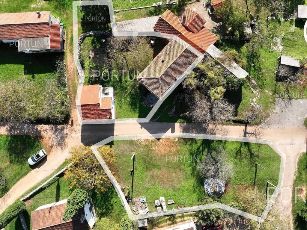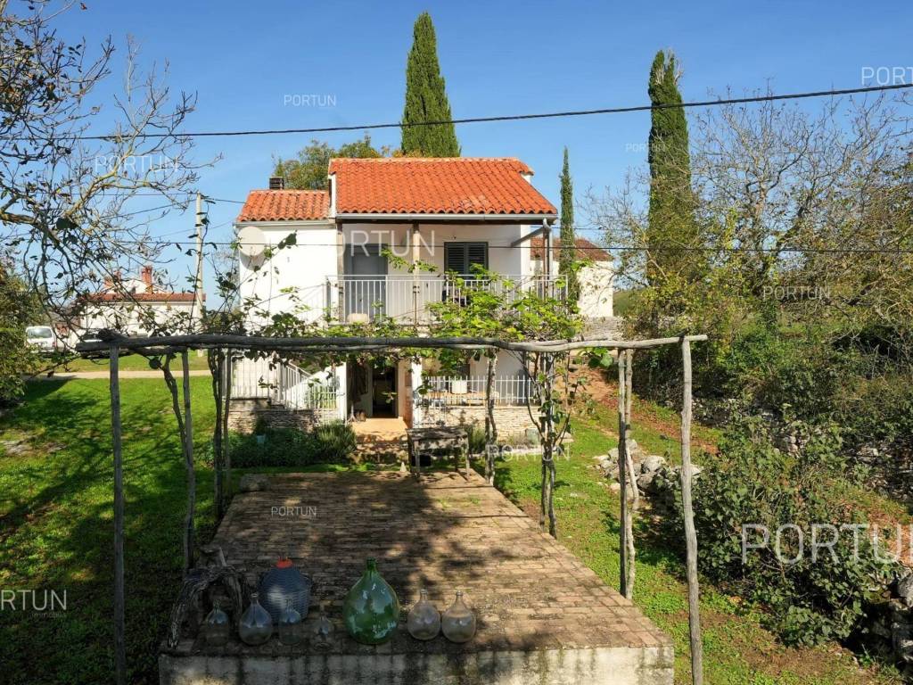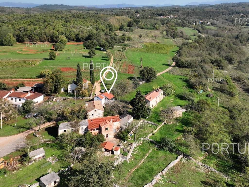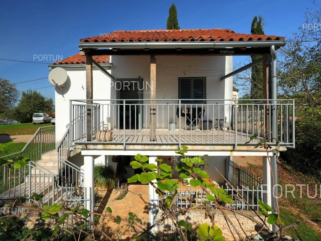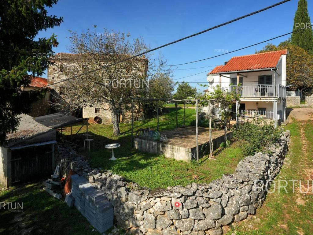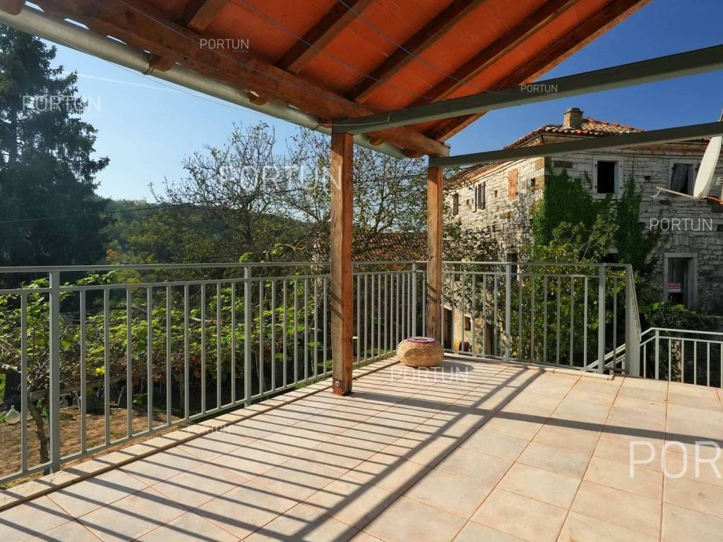 In this idyllic location, in a quiet village not far from Oprtalj, there is a property with two houses and a yard, perfect for those looking for peace and a wonderful view. The houses are located on the southwest slope, with an open view of wooded hills and meadows. In this location you can enjoy peace and quiet, because there are only a few rural houses in the area. The property is only a few minutes' drive from Oprtalj and Grožnjan, beautiful parts of Istria, famous for Parenzana and excellent inns offering local truffles. There are two houses on the estate. The larger house is completely abandoned and needs renovation. It originally had three floors, and the external dimensions are approximately 13 x 6 m. The smaller house was thoroughly renovated and modernized about 20 years ago and was subsequently legalized. It consists of two residential floors and an attic, with a total of 63 m of usable area. The bedroom and living room are on the first floor, while the bathroom, kitchen and dining room are on the ground floor. On each floor there is one large covered terrace facing south. An integral part of the property is an additional yard on the other side of the street, with an area of 737 m, where a parking lot, garden or swimming pool can be arranged. The ideal location offers an opportunity to build your own cottage or holiday home - the proximity of Grožnjan, Oprtlje and Parenzana are strong arguments in favor of this special property. LocationOne of the most developed and beautiful regions of Croatia is green-blue Istria, known as the "new Tuscany", which represents a combination of unique natural sights and rich cultural heritage. Quiet location in northern Istria, where the house is positioned, offers numerous amenities:Sea | Beach 27 km Services | Inn or restaurant 3 km - Elementary School 3 km Sports and fun | Thermal spa Istarske toplice 12 km Nearby towns | Grožnjan 12 km - Novigrad 30 km Traffic | Nearest highway entry 18 km Attractions | Protected forest in the Mirna river valley 10 km About the propertyThe estate which extends to 1.307 square meters comprises: House for adaptation | 3 Floors - The largest external dimensions are 13 m x 6 mRenovated house | 2 Floors - 62,85 m2EquipmentJoinery | Wooden joineryHeating | Air conditioning - Furnace - woodFlooring | Ceramic tilesServices Connection to the power grid Connection to the water supply network Septic tank Paved public access roadReal estate statusThe land is located entirely within the boundaries of the construction area. DocumentationExtracted documents | Decision on the constructed condition of the buildingArea calculationArea of the house includes (approx. 242,85 m2): Interior space (House for adaptation) = 180,00 m2Usable surface (Renovated house) = 62,85 m2**Area is given with accrued coefficientsThe total land area including the footprint of the building(s) amounts to 1.307 square meters. Data source = Cadastre data