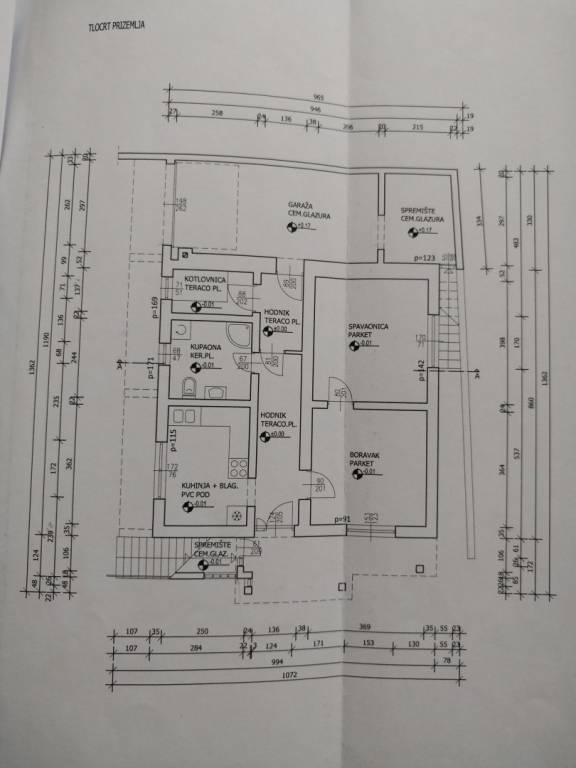- Prizemlje kuće je 116 m2 i sastoji se od dnevnog boravka, spavaće sobe, kuhinje s blagovanjem, hodnika, kupaonice, kotlovnice, spremišta i garaže.