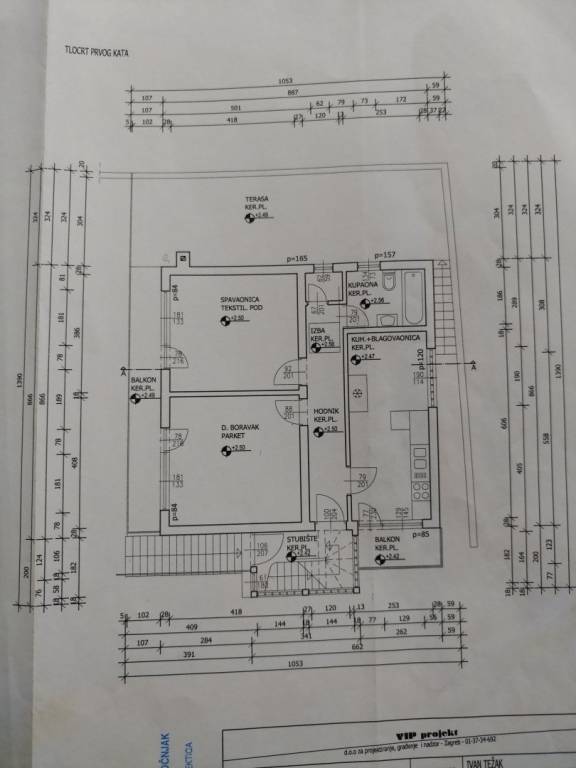 - Drugi kat je površine 68,47 m2, nije uređen (pripremljene su cijevi za plinsko grijanje, dovod i odvod vode, struja), sastoji se od dvije sobe, kupaonice i kuhinje.