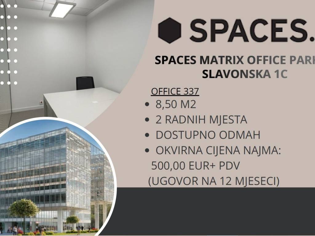 34 m2 = 9 radnih mjesta; 3/6/12 mjeseci = 1.460 € / 1.496 € / 1.615 € + PDV