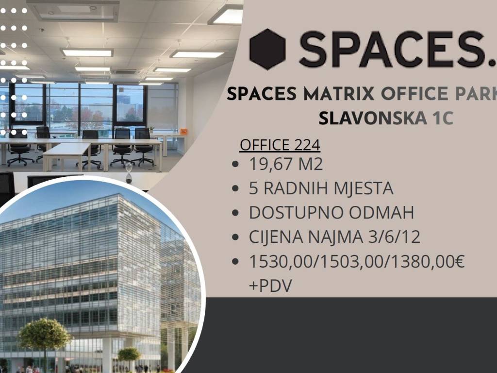 19.67 m2 = 5 radnih mjesta; 3/6/12 mjeseci = 1.380 € / 1.503 € / 1.530 € + PDV