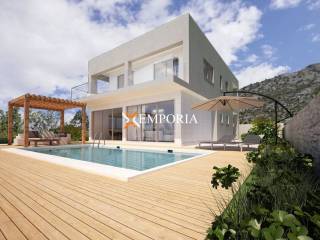 For sale is a modern newly built house located in an attractive area of Starigrad, only 360 m from the sea and 790 m from the town center. This impressive property combines luxury, contemporary architecture, and a stunning sea view, making it perfect for comfortable family living or as a high-return investment in tourism.The house extends over three levels – basement, ground floor, and first floor, with a total net living area of 288,07 m², while including the 30 m² heated pool, the total area reaches 318,07 m².