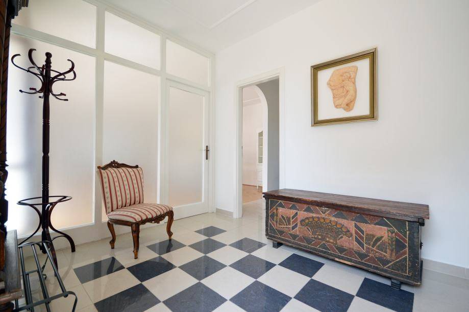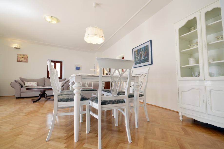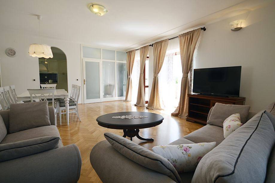 Stan se nalazi na prvom katu, ulaz je iz dvorišta, a sastoji se od: hodnika, dnevnog boravka s blagovaonicom, kuhinje, tri spavaće sobe, dvije kupaonice s wc-om, garderobe i otvorene terase.