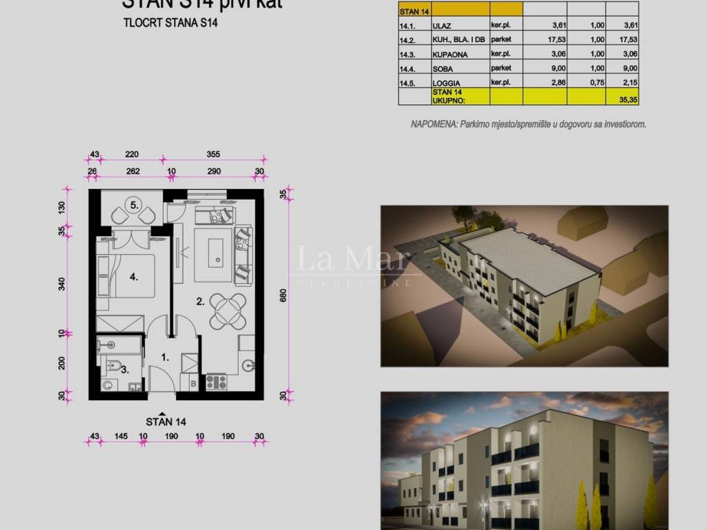 Stan S14 na I. katu ukupe neto površine 35,35 m2 sastoji se od ulaza, kuhinje, blagovaone i dnevnog boravka, kupaonice, jedne spavaće sobe te loggie.