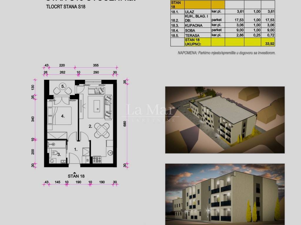 Stan S18 na II. katu ukupe neto površine 33,92 m2 sastoji se od ulaza, kuhinje, blagovaone i dnevnog boravka, kupaonice, jedne spavaće sobe te terase.