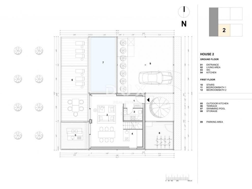 The ground floor of the villa consists of an open-space living room with large glass walls and direct access to the terrace, a kitchen connected to the dining room, a wardrobe and a guest toilet. The space is functionally designed, with excellent natural light and a direct connection to the exterior.