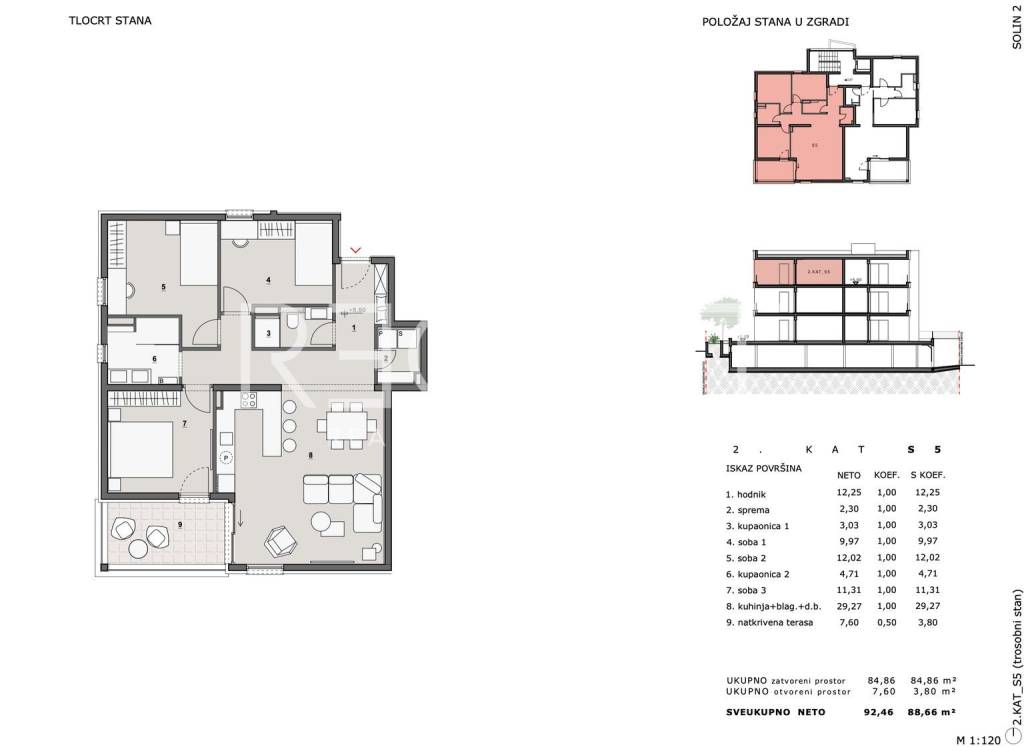 Three-room apartment located on the ground floor of a modern new building in a great location in Solin. The apartment is ideal for family life, but also as a long-term investment. The apartment has a total net area of 88.66 m², and consists of a hallway, storage room, two bathrooms, three rooms and a spacious kitchen with dining room and living room. The living room and one bedroom open onto a covered terrace which provides additional space for relaxation. Equipment and additional amenities: High-quality materials : High class parquet and tiles in the apartment, PVC windows with electric shutters and mosquito nets Safety and privacy: Security door, Herman garage door, video surveillance and video intercom Heating and cooling: Underfloor heating in bathrooms, air conditioners for cooling and heating Elevator : Direct access to the apartment via elevator from the garage The property is located in an attractive location in Solin, a few minutes walk from the city center and all key amenities, including schools, shops, health facilities, public services and parks. The distance to Split is only 6 km, while Split Airport is a 15-minute drive away. It is possible to purchase a garage parking space and a storage room of 3 m². The building is under construction, and the completion of works is scheduled for spring 2026. For more information or to arrange a viewing, feel free to contact us