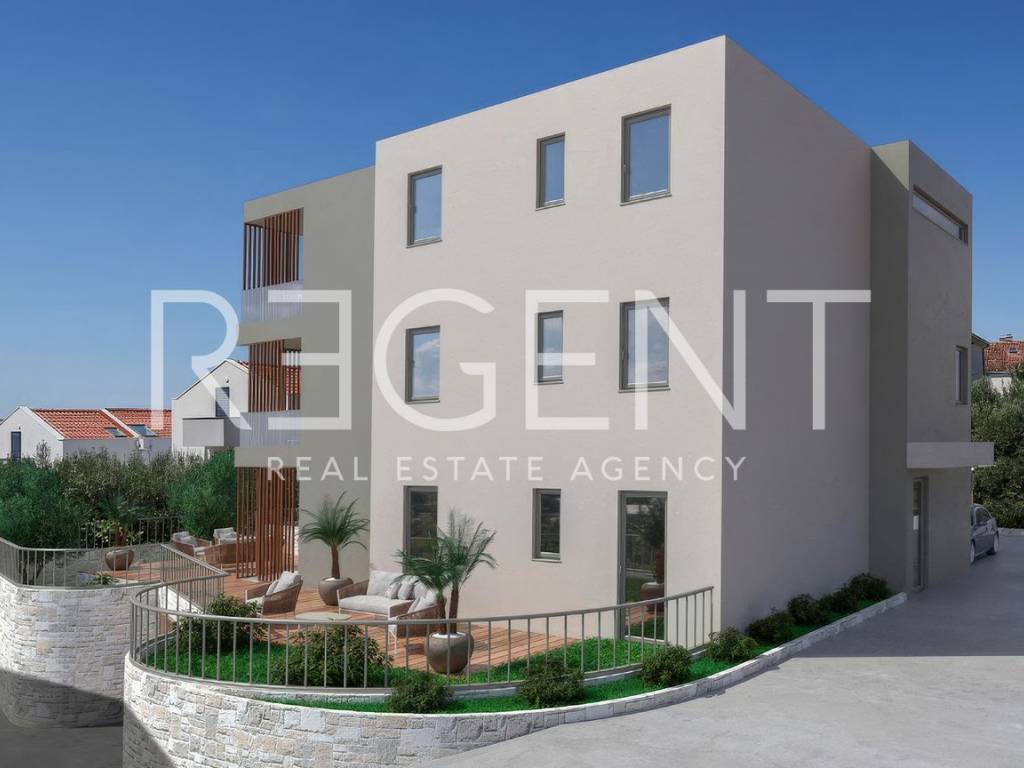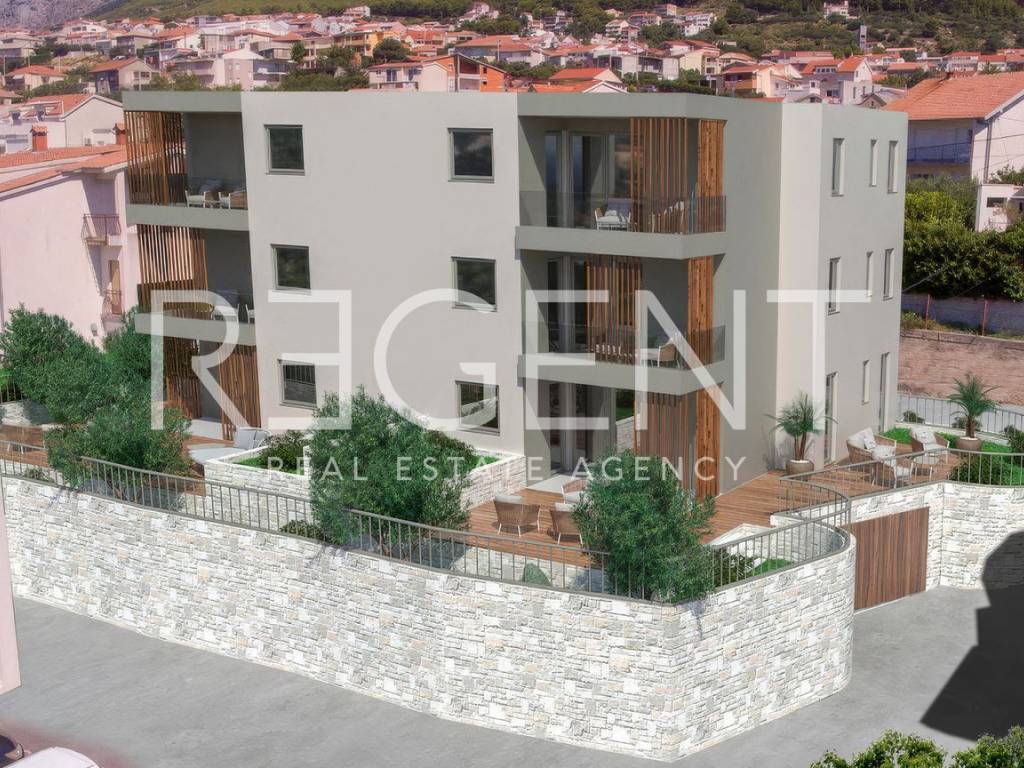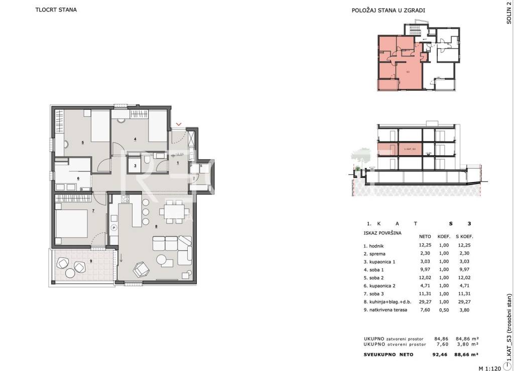 Three-room apartment located on the ground floor of a modern new building in a great location in Solin. The apartment is ideal for family life, but also as a long-term investment. The apartment has a total net area of 88.66 m², and consists of a hallway, storage room, two bathrooms, three rooms and a spacious kitchen with dining room and living room. From the living room and one bedroom there is access to a covered terrace which provides additional space for relaxation. Equipment and additional benefits: High-quality materials : High class parquet and tiles in the apartment, PVC carpentry with electric blinds and mosquito nets Safety and privacy: Security door, Herman garage door, video surveillance and video intercom Heating and cooling: Underfloor heating in the bathrooms, air conditioners for cooling and heating Elevator : Direct access to the apartment via an elevator from the garage The property is located in an attractive location in Solin, a few minutes' walk from the city center and all key amenities, including schools, shops, health facilities, public services and parks. The distance to Split is only 6 km, while Split Airport is a 15-minute drive away. It is possible to buy a garage parking space and a storage room of 3 m². The building is under construction, and the completion of works is scheduled for spring 2026. For more information or to arrange a viewing, feel free to contact us