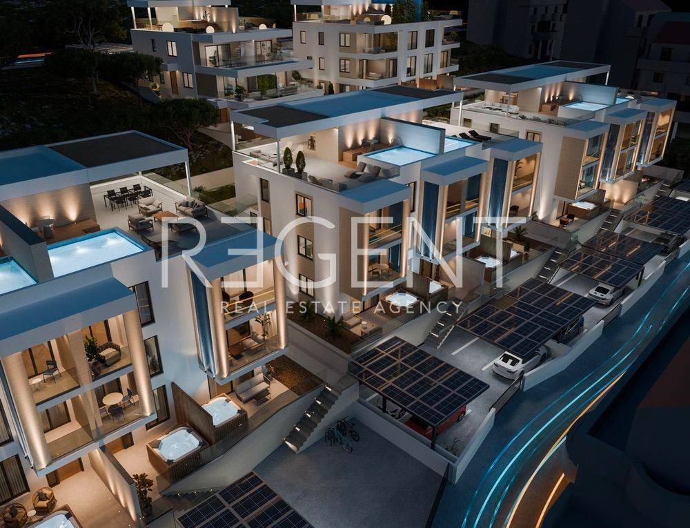 Exclusive sale of apartments in a new apartment complex on the island of Čiovo, located on the first floor, near the sea, with extraordinary views of the Adriatic Sea and the city of Split. All apartments offer sea views, and the project itself is carried out according to the highest standards of modern construction. The penthouse has an area of 162.56 m² and consists of: Hallway: 4.20 m² Hallway: 12.82 Room 1: 6.63 m² Room 2: 8.91 m2 Room 3: 9.31 m2 Bathrooms: 3.94 and 2.80 m² WC: 2.43 m2 Spacious living room with dining room and kitchen: 40.24 m² Terrace: 12.15 m2 Terrace: 42.17 m2 Covered terrace: 29.20m2 Terrace-jacuzzi: 25.44 m2 Staircase: 10.65 m2 Special emphasis is placed on the possibility of investing with a guaranteed return. The investor offers the possibility of renting purchased apartments for tourist rental and takes over complete management and hospitality services, ensuring the owners a return on investment. Buyers do not have to worry about the operational aspects of renting, because the investor does it in their name, enabling a safe income through tourist rental. The investor also offers the option of equipping the apartments and interior design according to the highest standards, with a modern design adapted to the requirements of customers. This ensures that the apartments are fully equipped and have a luxurious look, ready for use or rental. This project is one of the first of its kind in this area, and similar concepts are successfully applied all over the world. Čiovo is an ideal location due to its proximity to the historic town of Trogir, a UNESCO World Heritage Site, as well as its direct connection to the mainland by a bridge, making it easily accessible and attractive to tourists. This settlement represents a rare investment opportunity in an attractive location, with excellent potential for generating income from tourist rentals and long-term property value.