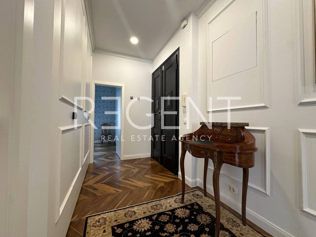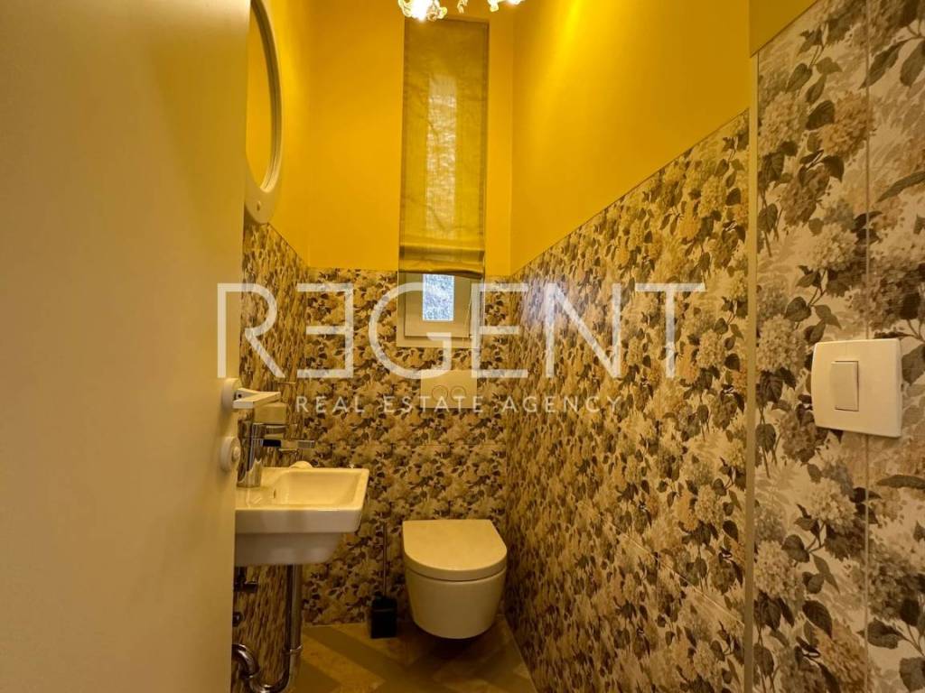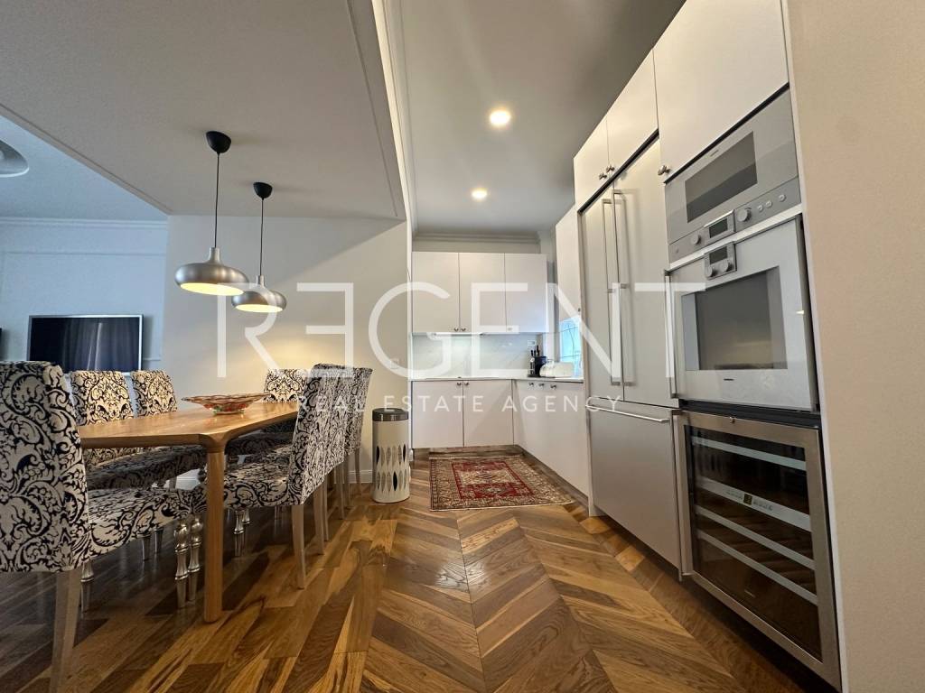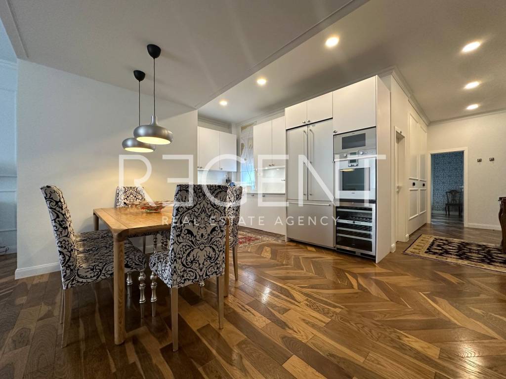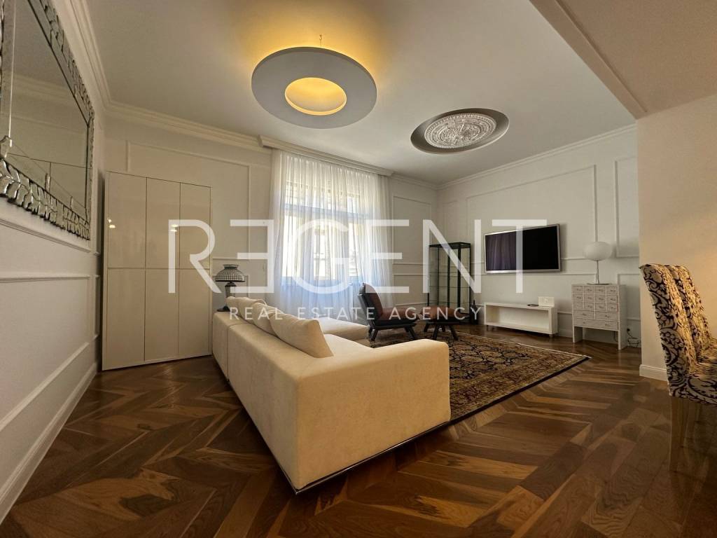In the city center, in a prime location in the pedestrian zone, there is a four-room apartment for rent with an area of 115 m2, on the third floor of a residential building. The apartment consists of: three bedrooms, two bathrooms, a toilet, an open space living room with kitchen and dining room, a pantry and a balcony. The orientation of the apartment is north-south. Heating is underfloor in the bathrooms, and rooms with radiators. Cooling in the apartment is air conditioning in the suspended ceilings. The apartment is fully furnished and contains a washing machine, dryer and all appliances in the kitchen. Top location, city center surrounded by all essential living facilities (school, kindergarten, shops, banks, restaurants, pharmacies) Contact us for more information.
