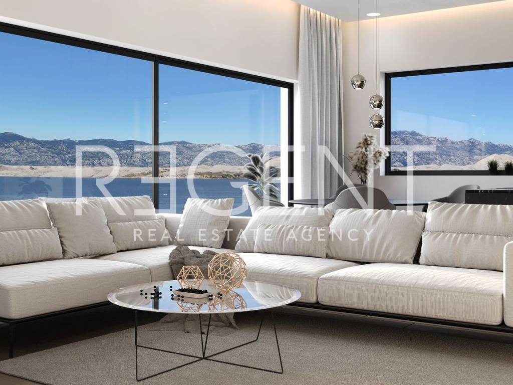 On Pag, in a quiet location in a luxurious new residential building consisting of 4 apartments, there is a three-room apartment with a total area of 94.48 m2. The apartment is located on the 1st floor. It consists of: an entrance hall, a spacious living room and an open concept kitchen with a sliding wall that offers an indescribable panoramic view of the sea, a terrace with access to the pool, two bedrooms, a bathroom and a separate toilet. The villa includes a shared pool of 39m2, content next to the pool (sunbeds, chairs, shower), access to the beach, video surveillance of the property and 4 parking spaces. Only the highest quality materials were used in the construction, which ensures top insulation, durability and energy efficiency, which further contributes to the feeling of luxury and security. Also, the apartments are equipped with the most modern specifications such as PVC windows with electric blinds, underfloor heating in the bathroom, glass railing, smart air conditioners for heating and cooling... The luxurious new residential building is located on top of a cliff in a beautiful and peaceful environment, providing a wonderful panoramic view of the sea. It is only 4 kilometers from the center of Pag, where all the necessary facilities are located (shops, cafes, restaurants, pharmacy, school). Energy Certificate: A+ Orientation: West, East, North, South For more information, please contact us!