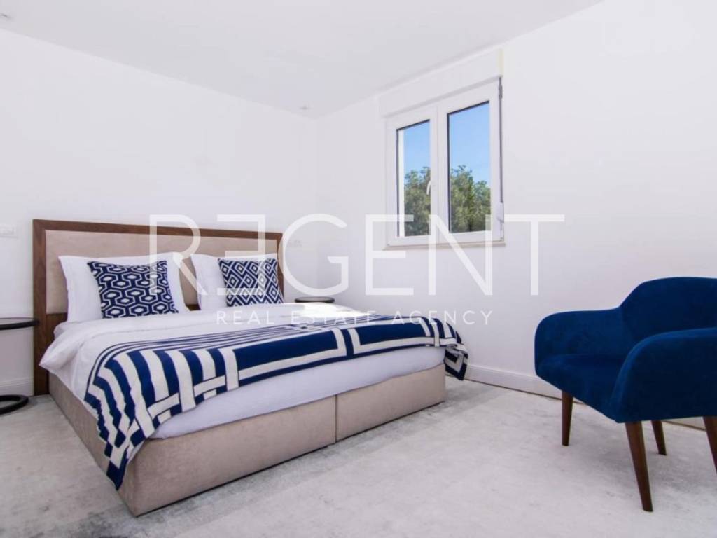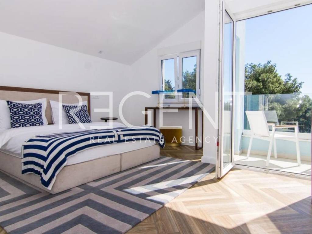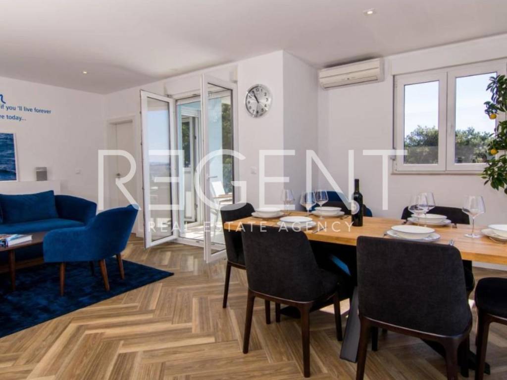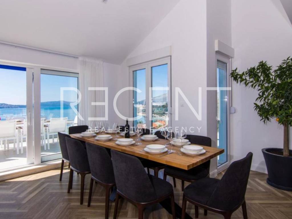 We are mediating the sale of a five-room penthouse with a spacious terrace and a unique sea view in Trogir. The penthouse is spread over two floors with a total area of 185.83 m², of which the lower floor has 122.29 m² and a spacious terrace of 46 m2, and the upper floor 63.54 m². The layout of the space is organized in such a way that the lower floor has an open living room with kitchen and dining room, three rooms with associated bathrooms and access to the terrace. The upper floor consists of two rooms with bathrooms and a fantastic sea view. Considering the position of the apartment, the terrace offers an impressive view of the sea, which merges with the sea horizon. A marina for luxury yachts will be built nearby, which will further increase the attractiveness of the view and location. A pebble beach is located in the immediate vicinity, a perfect destination for everyday enjoyment. The penthouse has two garages and one outdoor parking space. Trogir, with its rich history and UNESCO-listed old town, is a popular destination for tourists throughout the year. This penthouse, close to the beach, is ideal for tourist rentals, providing an opportunity to generate income. For all other inquiries, as well as viewings, feel free to contact us!