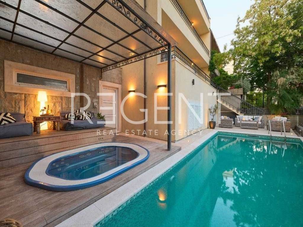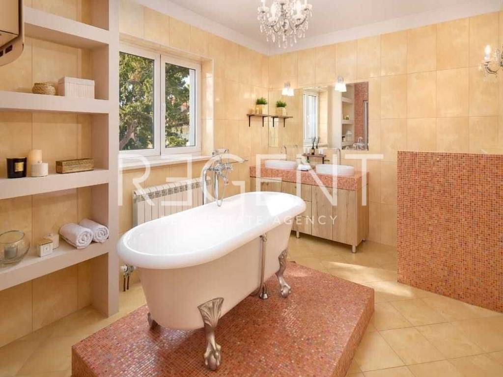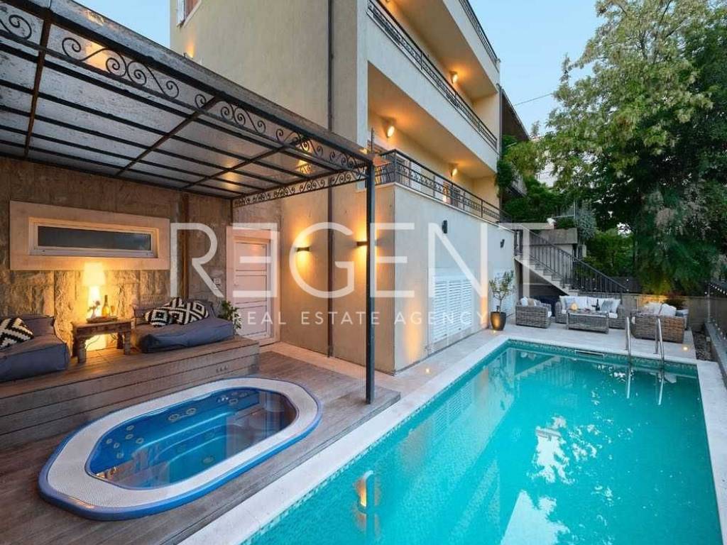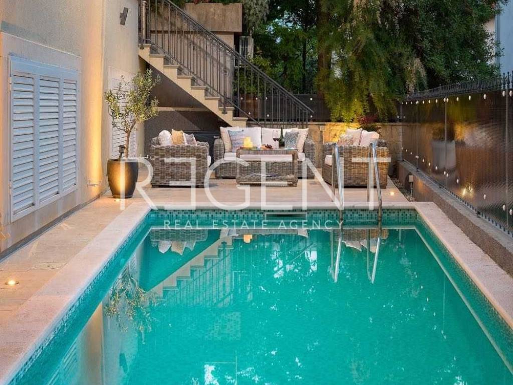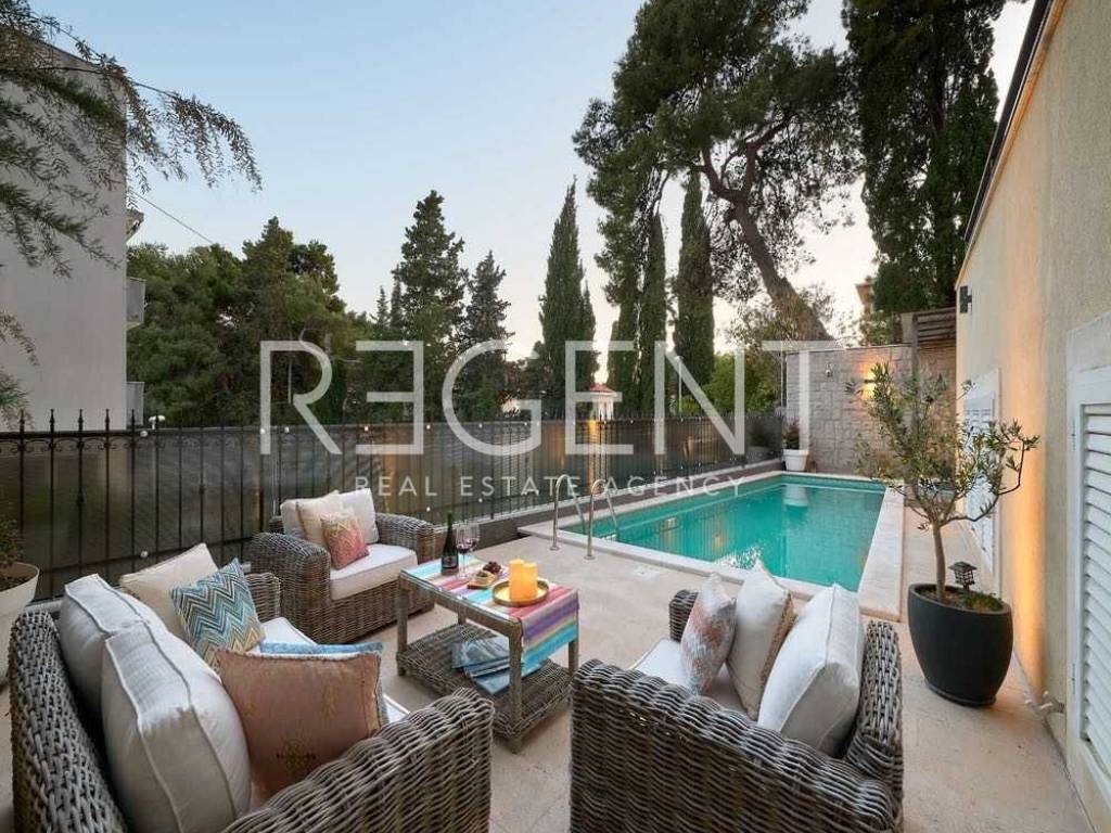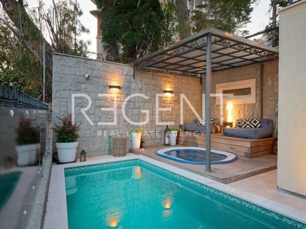This exceptional property is located in the immediate vicinity of the city center and the iconic sandy beach of Bačvice. The size of the villa is 480 square meters of gross living space and is located on a plot of 335 square meters. It is built on four floors. The basement consists of a room for celebrations, a small kitchen, a study and a bathroom. The ground floor has a spacious living room, kitchen, dining room, pantry and toilet. There are two exits to the terraces through which the ground floor of the house is connected to a nicely organized and maintained garden that includes a swimming pool, jacuzzi and sunbathing area on the south side, and a summer dining room located on the terrace on the east side. On the first floor there are three bedrooms with en-suite bathrooms and exits to the terraces, and a room used for laundry care, while the second floor of the house occupies the main bedroom, which includes a separate work area, a bathroom with a sauna, a large wardrobe, and a spacious terrace with a beautiful sea view. The villa also contains a private garage. Due to its exceptional location, this property is an excellent investment for tourism due to its proximity to the most attractive facilities offered by the city of Split. For all other information, feel free to contact us!