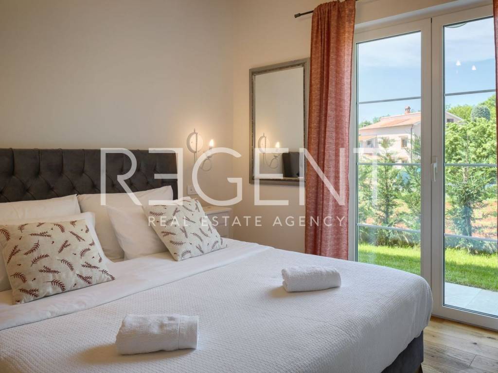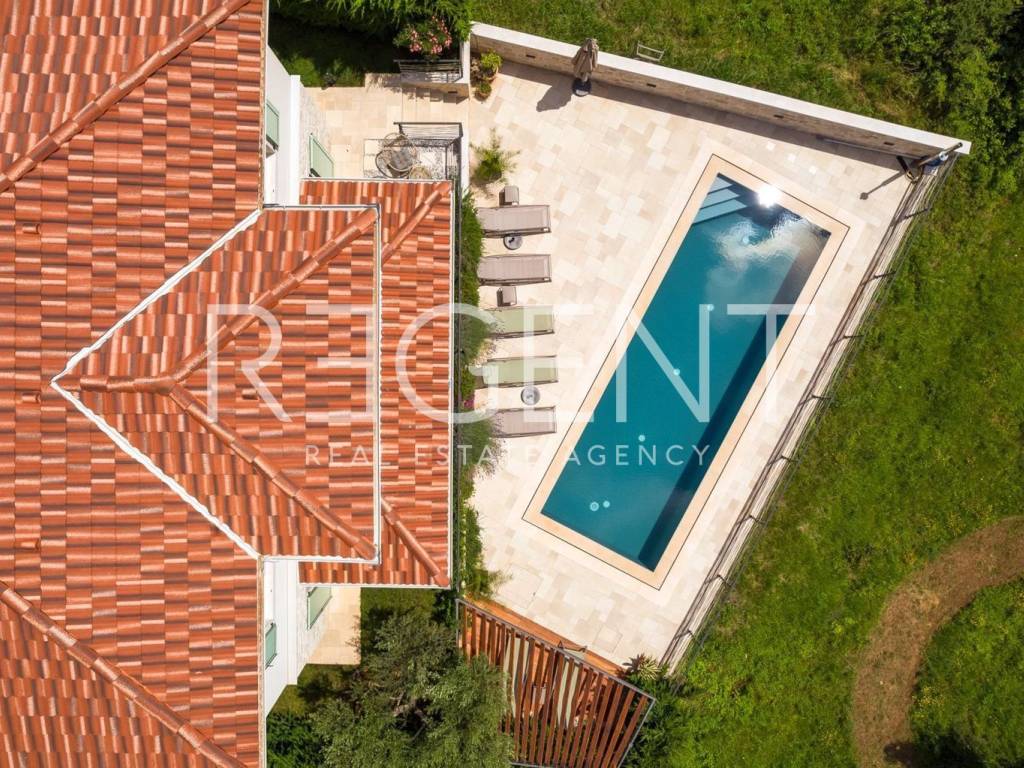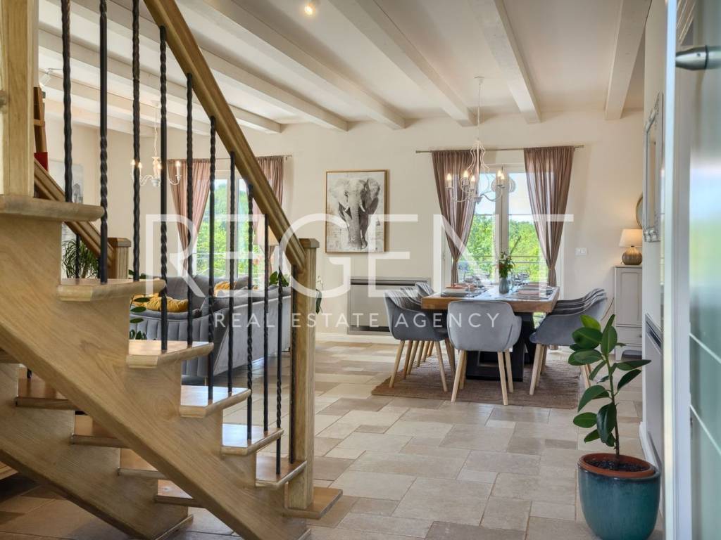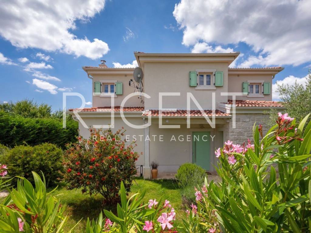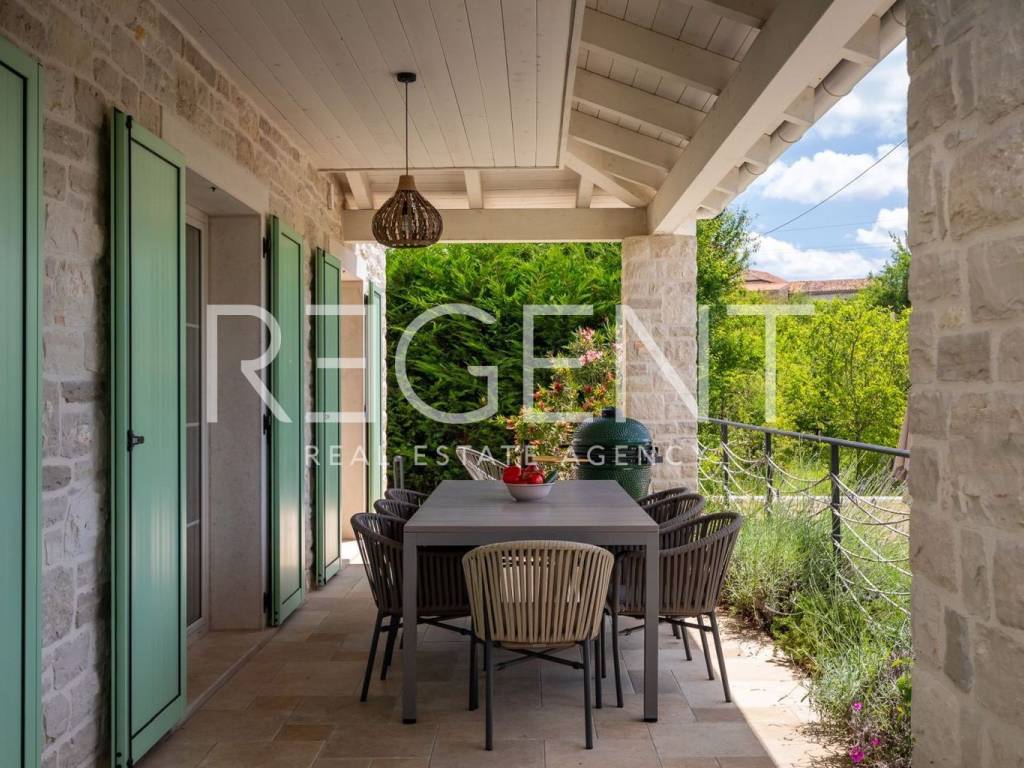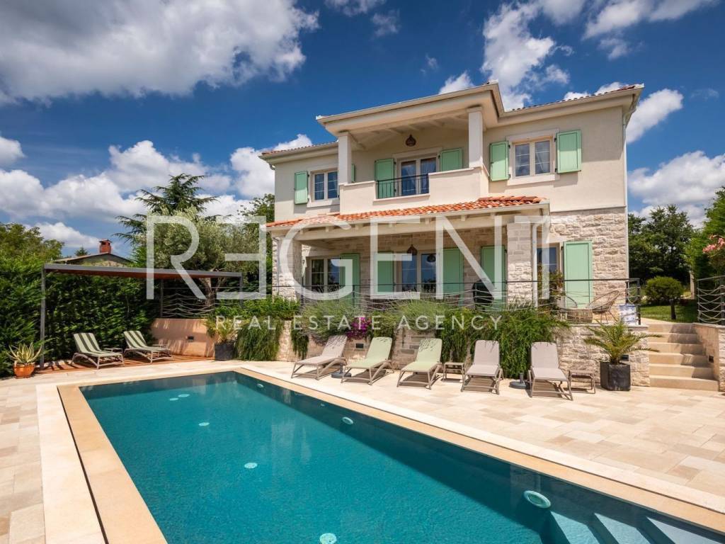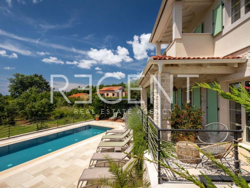 Located in the idyllic Istrian landscape, this modern stone villa built in 2021 offers the perfect combination of luxury, privacy and authentic Mediterranean atmosphere. With a total area of 170 m², it offers a spacious and functional layout, ideal for family life or as an investment for tourist rental. Layout and contents of the villa Four spacious bedrooms, each with its own bathroom Additional separate guest toilet Living room, kitchen and dining room with open concept Quality materials and carefully selected details for maximum comfort Underfloor heating in all rooms, Mitsubishi heat pump Fan coil units in all rooms with heating/cooling options Outdoor space 31 m² swimming pool with sun deck and sun loungers Covered terrace with outdoor fireplace and grill Fenced yard with landscaped green garden, ideal for family and pets The villa is located near Višnjan, and all important amenities such as shops, restaurants and cultural attractions are easily accessible. With a spectacular panoramic view of nature, this property offers a superior living experience and represents an ideal combination of peace and comfort. For more information and to arrange a viewing, contact us!