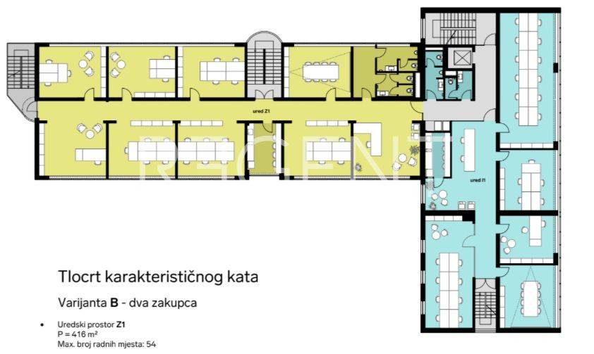 Uredski prostor smješten je na trećem katu poslovne zgrade u Selskoj ulici, na izvrsnoj lokaciji u zapadnom dijelu Zagreba. Prostor je idealan za tvrtke koje traže reprezentativan ured u kvalitetnoj i moderno opremljenoj zgradi. Poslovni prostor ima ukupnu površinu od 416 m² i sastoji se od više funkcionalnih cjelina koje je moguće prilagoditi prema potrebama zakupnika. U prostoru su spušteni stropovi u hodnicima i sanitarijama, tepih kao završna obloga u uredima, dok su sanitarije obložene keramikom, a kuhinjski dio LVT oblogom. Opremljen je VRF Daikin sustavom grijanja i hlađenja, LED rasvjetom te parapetnim kanalima s utičnicama i mrežnim priključcima na svakom radnom mjestu. Zgrada se nalazi u poslovnom dijelu Selske ceste, svega 200 metara od tramvajske stanice i s izvrsnom prometnom povezanošću prema centru i zapadnom dijelu grada. U neposrednoj blizini nalaze se trgovine, restorani i svi potrebni sadržaji za ugodan radni dan. U prizemlju zgrade smješten je caffe bar. Zgrada je dovršena i odmah useljiva. Prostor se iznajmljuje po cijeni od 15 EUR/m² + PDV, uz troškove održavanja od 3 EUR/m² + PDV. U cijenu nisu uključeni režijski troškovi. U zakup je moguće uključiti i parkirna mjesta – tri u garaži te četiri vanjska. Minimalno trajanje zakupa iznosi tri godine. Za više informacija ili dogovor razgledavanja, slobodno nas kontaktirajte.