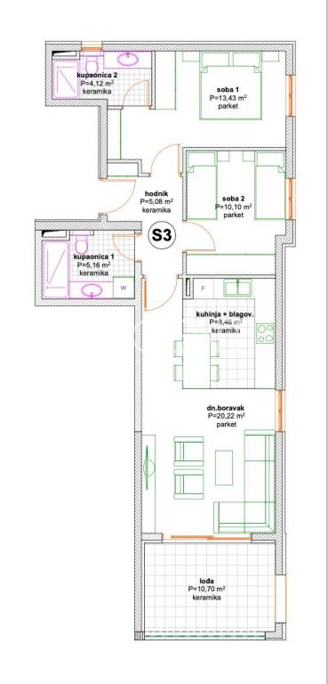 In a quiet part of Makarska, in the settlement of Makar, is located the Vista Mare Residence project – a modern residential building that combines modern design, high-quality construction, and the Mediterranean way of life. The building consists of a basement, ground floor, and three floors, connected by an elevator, and includes garage and outdoor parking spaces. Surrounded by greenery and a sea view, it represents a perfect blend of privacy and proximity to all amenities. On the first floor, there is a two-room apartment with an area of 67.94 m², which consists of a spacious living room, a kitchen with a dining area, two bedrooms, two bathrooms, a hallway, and a loggia. The apartment is excellently oriented and is filled with natural light, and the loggia provides a partial sea view. The interior is decorated with modern ceramics and multi-layered parquet, with an emphasis on elegance and functionality. High-quality materials have been used – PVC joinery with triple-layer glass, anti-burglary doors, and air conditioning in all rooms. Electric underfloor heating has been installed in the bathrooms, which further contributes to comfort. Thermal insulation and energy class A ensure optimal temperature throughout the year and low operating costs. Vista Mare Residence provides a perfect balance between a peaceful life and the proximity to city amenities. In the immediate vicinity, there are shops, a school, a kindergarten, and all the amenities needed for everyday life, while the beaches and the center of Makarska are only a few minutes' drive away. The apartment is immediately habitable and represents an ideal choice for families or couples looking for a modern, functional, and comfortable home in Makarska. For more information, as well as an appointment for a viewing, feel free to contact us!