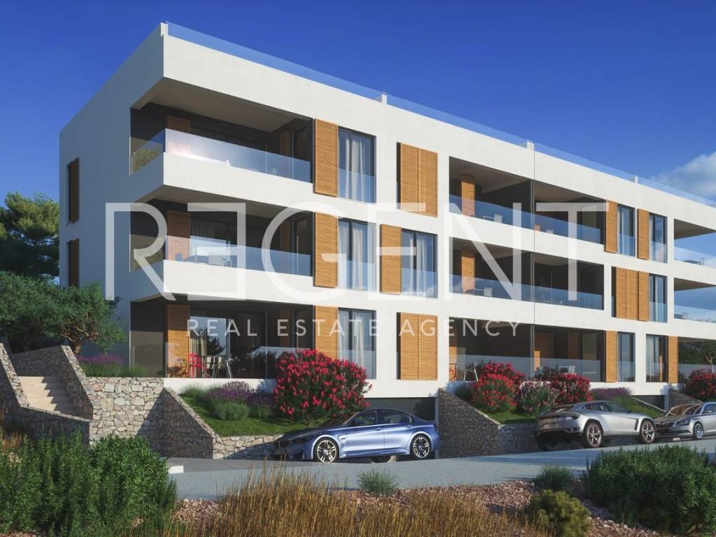 A three-room apartment located on the first floor of a modern new building in Trogir. It is ideal for families looking for a peaceful location near the sea or as a safe investment. Apartment B4 has a total area of 60 m² and a balcony of 12 m². The layout includes a living room with a kitchen and dining area, two bedrooms, a bathroom, and a hallway. The space is bright and functional, and the balcony provides a pleasant outdoor space for staying with a sea view. Located just 350 meters from the sea and a well-maintained beach, the apartment is in a quiet environment that offers privacy, while also being close to all the amenities needed for everyday life. The building is of reinforced concrete construction and is currently under construction. Completion of works is expected within 8-10 months, and moving in is possible immediately upon completion. Garage and outdoor parking spaces are available to residents. The distance to the sea is 350 meters. Payment is possible in phases. For more details and to arrange a viewing, please contact us with confidence.