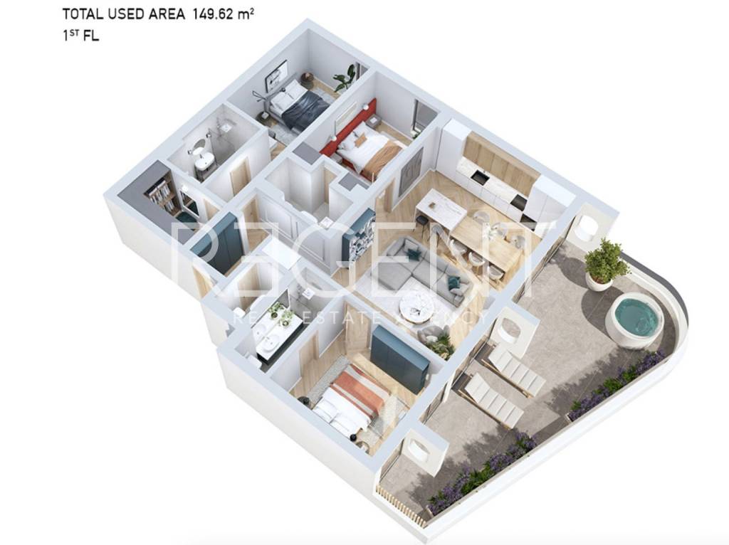 On an attractive location in Volosko, just 250 meters from the sea and near the center of Opatija, is this luxurious four-room apartment with a surface area of 145.96 m², located in a modern building with several exclusive residential units that ensure peace, privacy and a high level of comfort. The apartment is positioned on the 1st floor and is characterized by a thoughtful layout: entrance hall with wardrobe spacious open-space living room with kitchen, dining room and living room guest toilet three airy master bedrooms, each with its own bathroom the main room also has a walk-in wardrobe spacious terrace with preparation for jacuzzi One garage parking space and a storage room are included in the price. The apartment is equipped with high-quality materials, underfloor heating, air conditioning in all rooms, aluminum joinery with electric shutters and a top-quality security system. The building has an elevator and belongs to a high-efficiency energy class. This property is ideal for demanding buyers looking for a luxurious property to live in one of the most desirable seaside locations in Croatia, but also for those looking for a safe investment for tourist rental. For more information or to arrange a viewing, feel free to contact us.