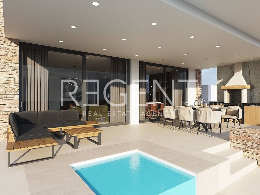 Luxury villa in the small fishing port of Kalebova Luka, not far from Ražanj and the famous Rogoznica, is an oasis of elegance and comfort by the sea. It consists of three floors, and each level offers unique rooms and facilities. Ground floor: Living room with kitchen and dining room, a space where functionality and aesthetics meet. Bathroom and storage room, additional practical elements that contribute to comfort. Exit from the living room to a spacious terrace, equipped with an outdoor living room, outdoor kitchen and fireplace. Swimming pool with sun deck and spacious garden, providing a perfect place to relax and enjoy privacy. Garage First floor: Three bedrooms, two bathrooms, laundry room and gallery. Exits to loggias, allowing you to enjoy the view of the surroundings from the comfort of your own home. 2nd floor: Bedroom with bathroom and wardrobe, fitness room, gallery. Three spacious terraces intended for relaxation and recreation, with the possibility of enjoying a beautiful panoramic view.   The villa is equipped with the highest quality equipment and modern interior design, creating an elegant and comfortable ambiance. It is ideal for those looking for peace, privacy and relaxation with all the amenities it provides. The location is perfect for people who want comfort and peace, while at the same time want to be close to all essential amenities.