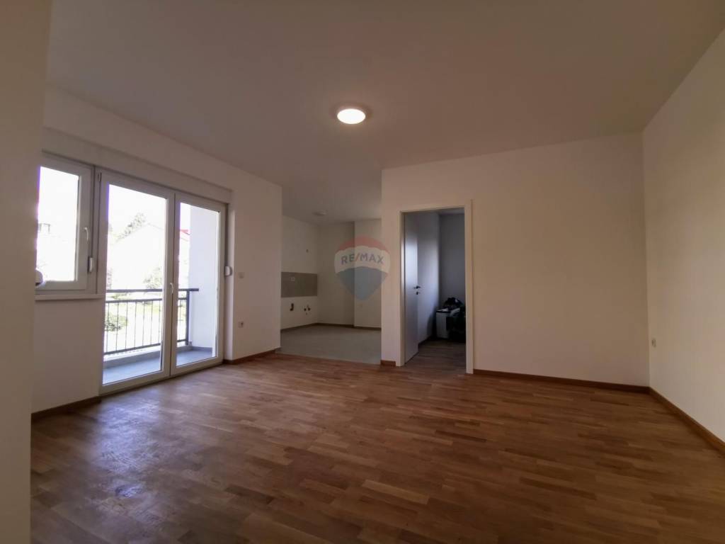 The apartment consists of an entrance hall, a spacious living room with a balcony, a kitchen with a dining room and a bedroom. The apartment also has a storage room on the ground floor and one designated parking space.