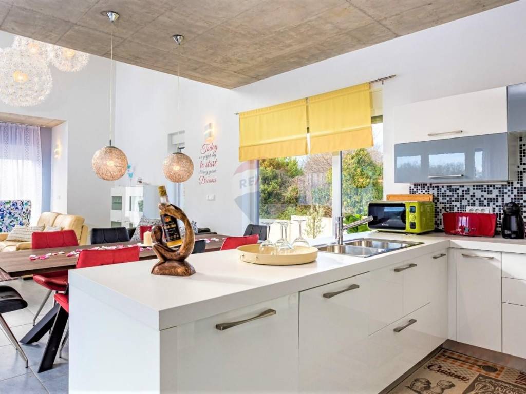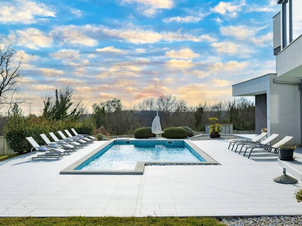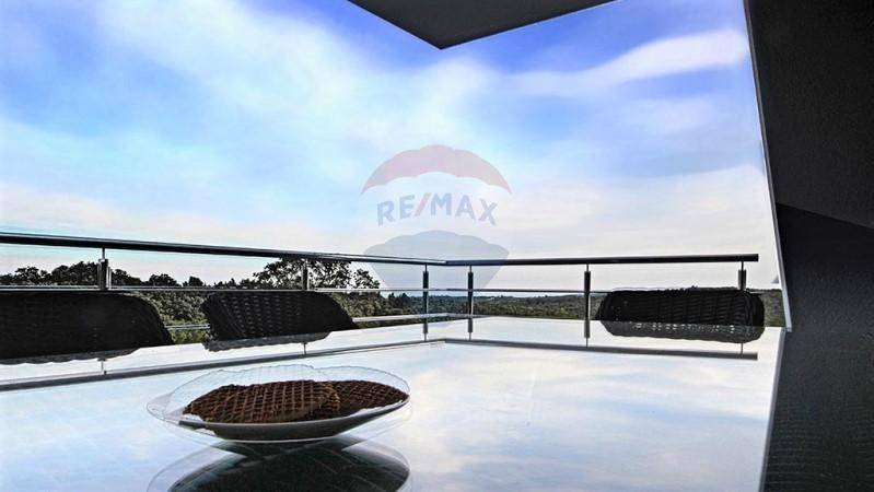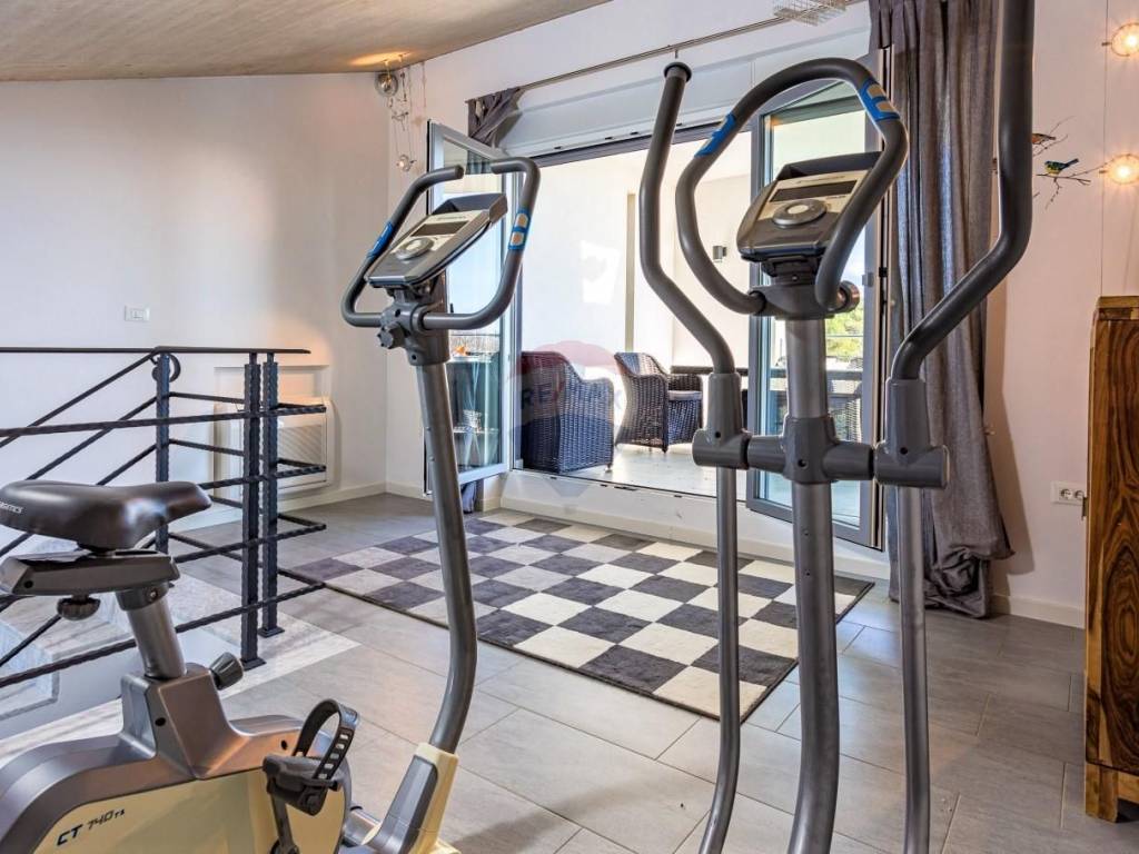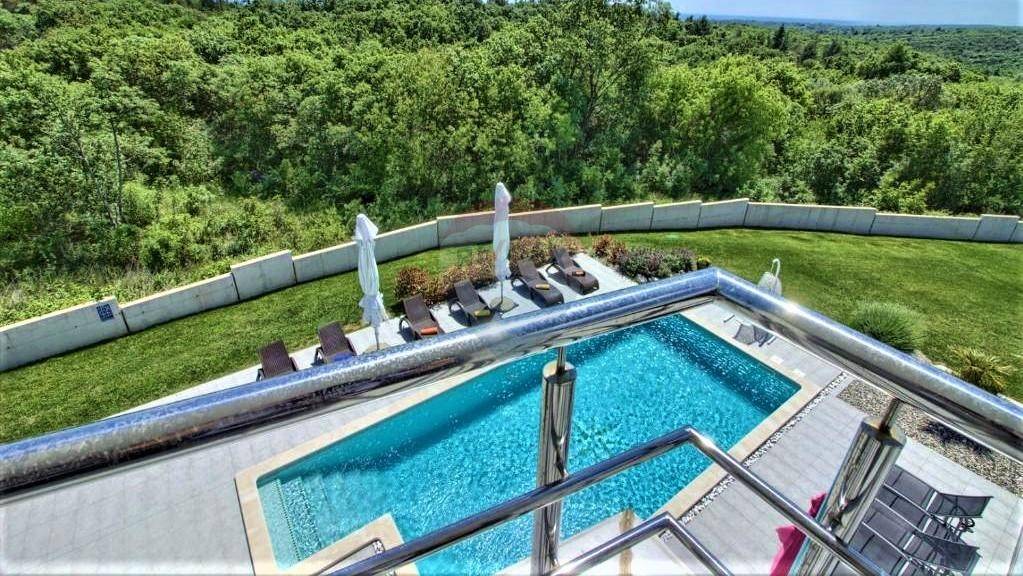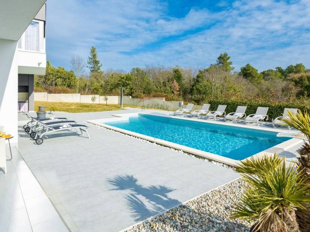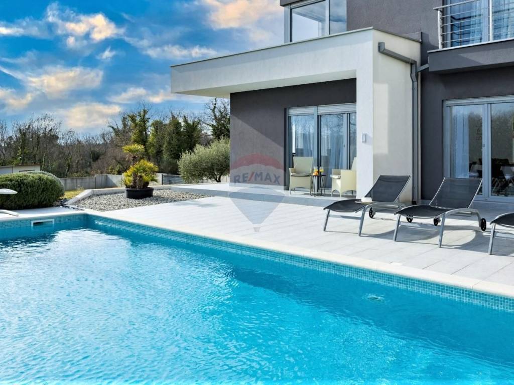 This luxurious modern villa imbued with stylistic balance is located on the east coast of Istria. It is located in the bay of Rakal and attracts attention with its design appearance, while the superior comfort and functionality of the villa confirm its quality. It was built on a plot of 1709 m2, while the net living area is 247 m2. The ground floor of the villa consists of a well-equipped, airy kitchen with a dining room, which unobtrusively merges with the comfortably furnished living room. Below, it is connected to the bedroom and dressing room, as well as the bathroom. Communication with the large pool and the environment is made possible by a covered porch and equipped terraces. On the first floor of the villa, there are three stylish bedrooms and two bathrooms, of which the master bedroom has a wardrobe and its own terrace with a view of the sea. The top floor of the villa is equipped with fitness equipment.