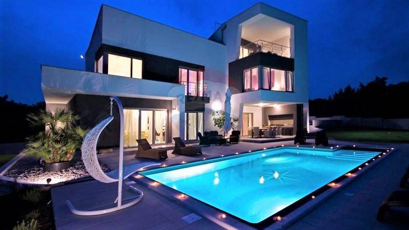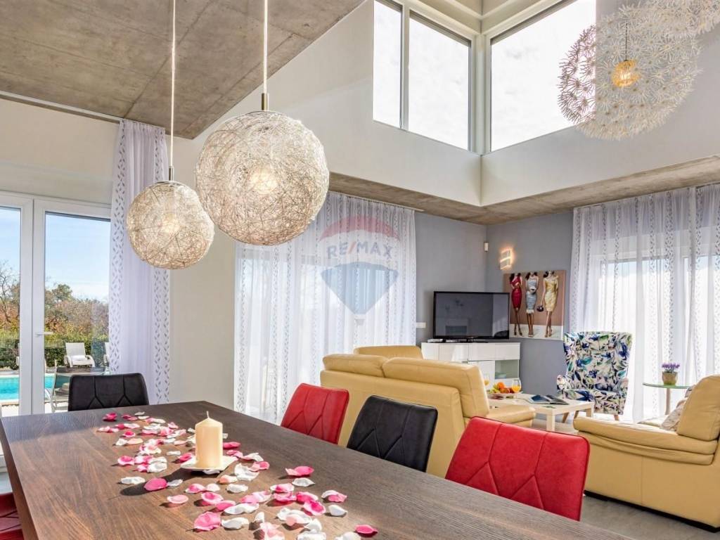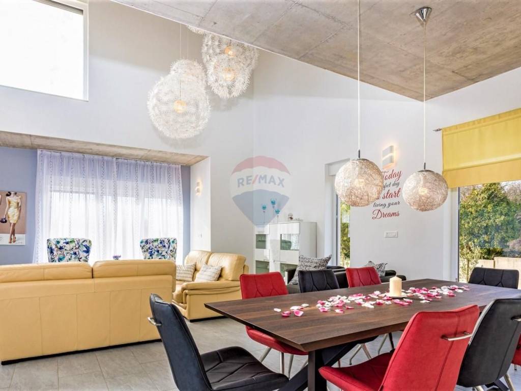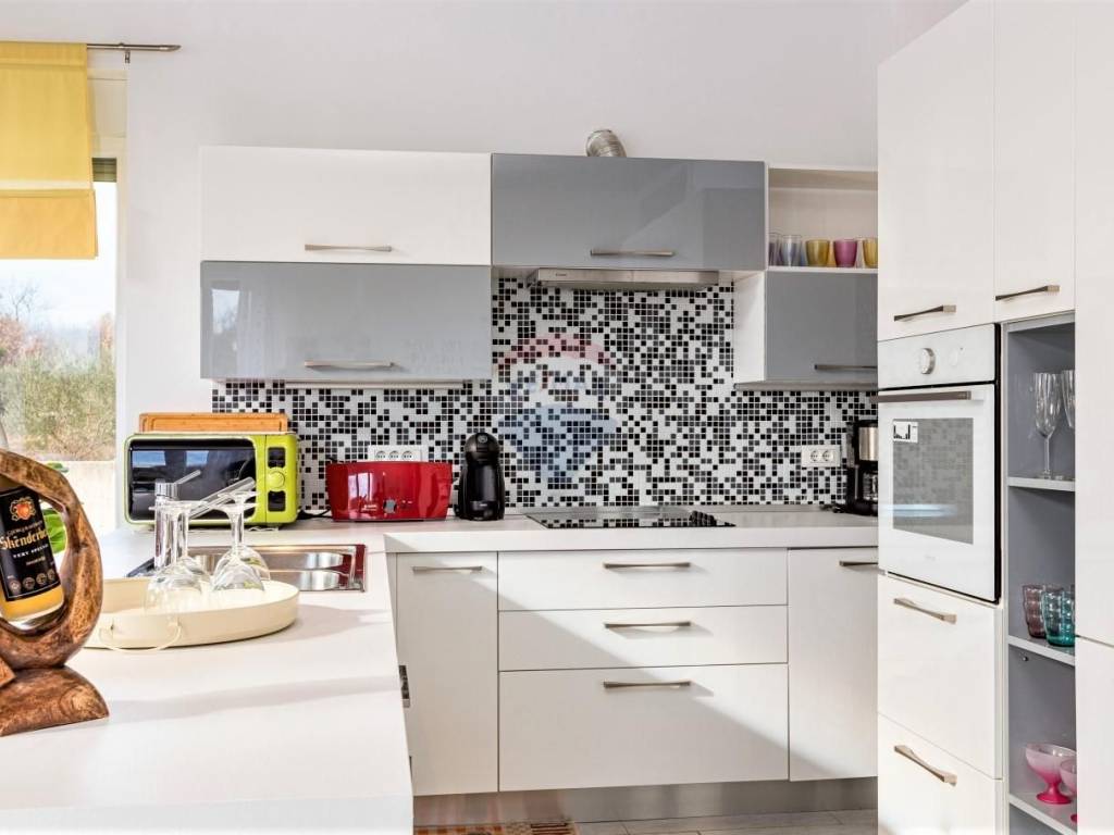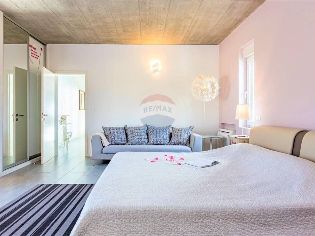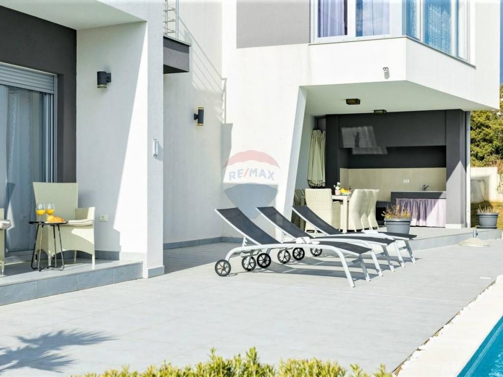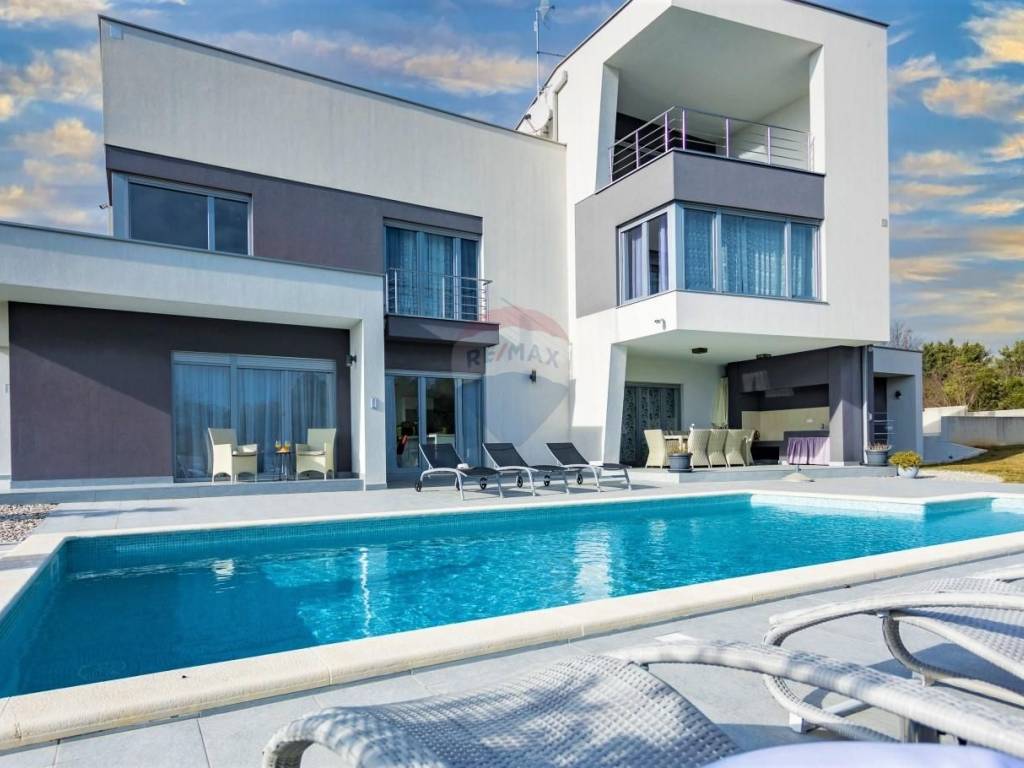 This luxurious modern villa imbued with stylistic balance is located on the east coast of Istria. It is located in the bay of Rakal and attracts attention with its design appearance, while the superior comfort and functionality of the villa confirm its quality. It was built on a plot of 1709 m2, while the net living area is 247 m2. The ground floor of the villa consists of a well-equipped, airy kitchen with a dining room, which unobtrusively merges with the comfortably furnished living room. Below, it is connected to the bedroom and dressing room, as well as the bathroom. Communication with the large pool and the environment is made possible by a covered porch and equipped terraces. On the first floor of the villa, there are three stylish bedrooms and two bathrooms, of which the master bedroom has a wardrobe and its own terrace with a view of the sea. The top floor of the villa is equipped with fitness equipment.