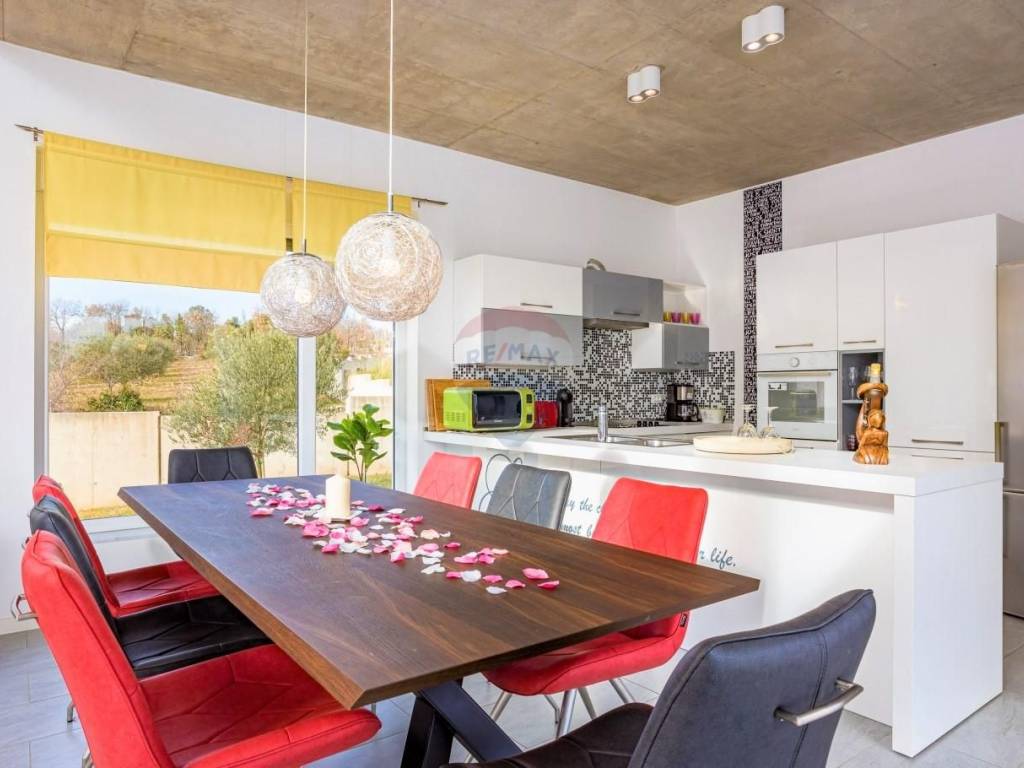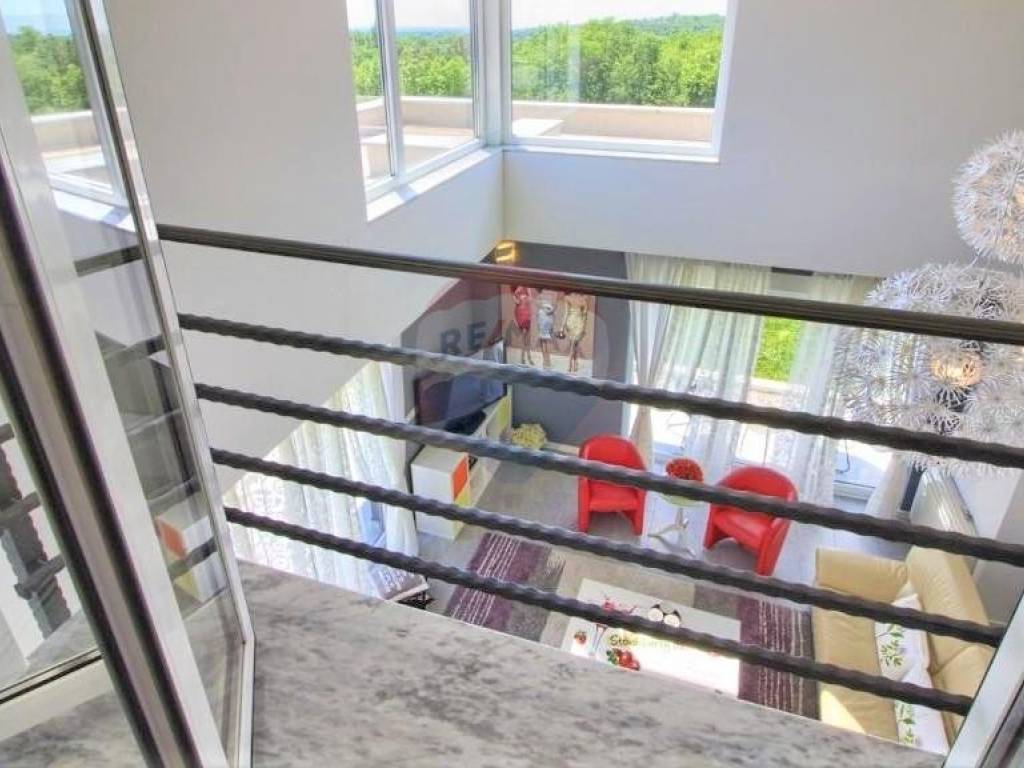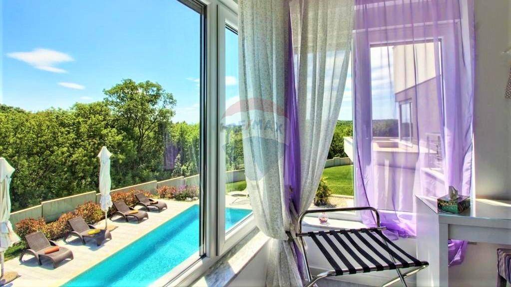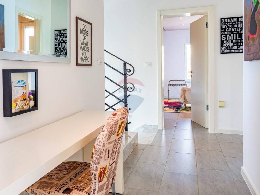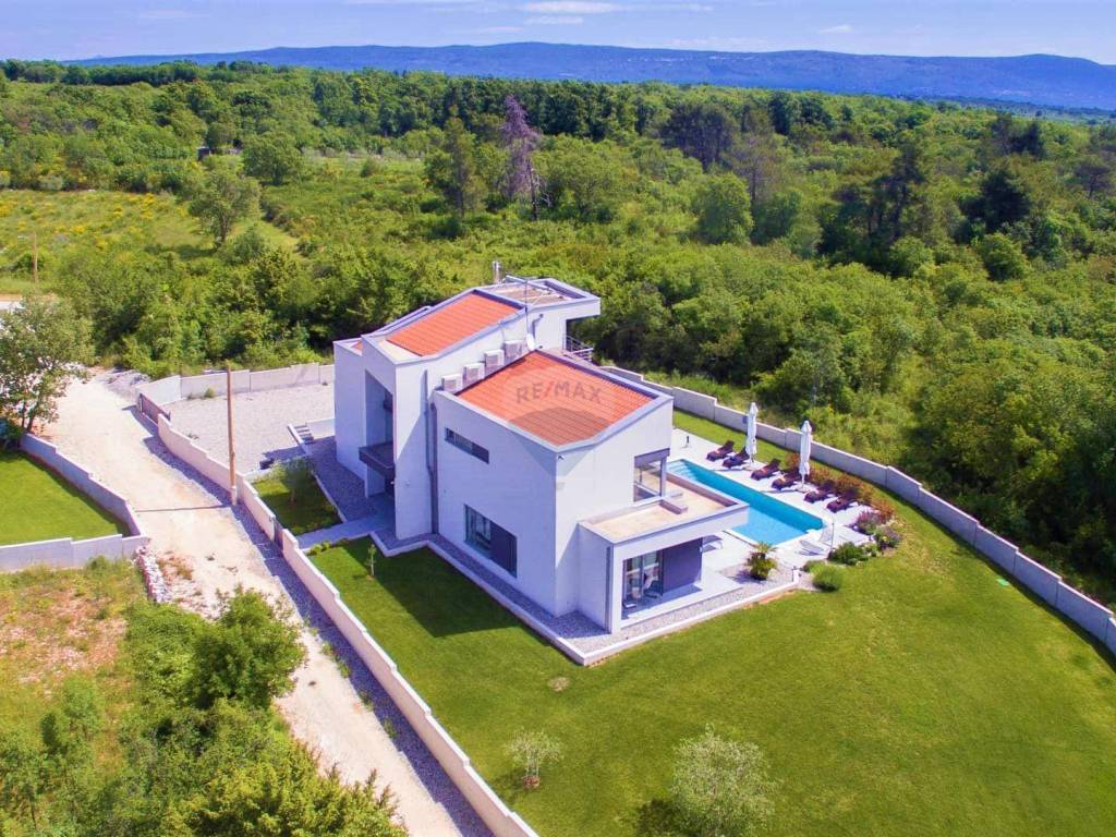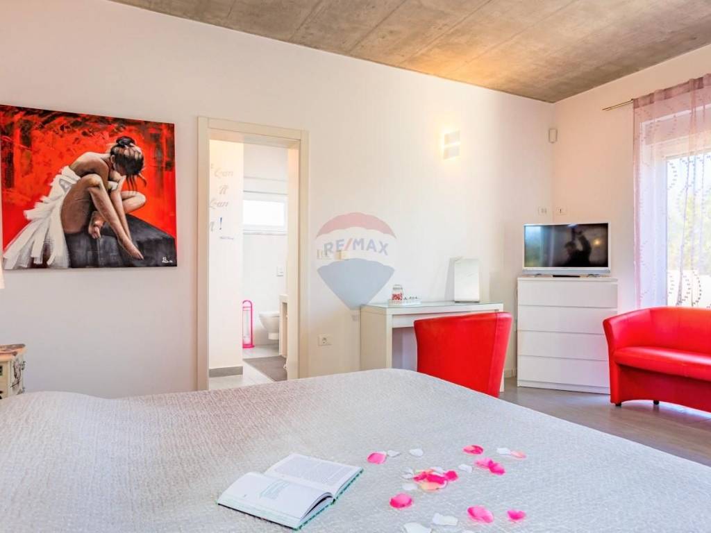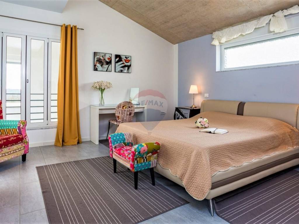 This luxurious modern villa imbued with stylistic balance is located on the east coast of Istria. It is located in the bay of Rakal and attracts attention with its design appearance, while the superior comfort and functionality of the villa confirm its quality. It was built on a plot of 1709 m2, while the net living area is 247 m2. The ground floor of the villa consists of a well-equipped, airy kitchen with a dining room, which unobtrusively merges with the comfortably furnished living room. Below, it is connected to the bedroom and dressing room, as well as the bathroom. Communication with the large pool and the environment is made possible by a covered porch and equipped terraces. On the first floor of the villa, there are three stylish bedrooms and two bathrooms, of which the master bedroom has a wardrobe and its own terrace with a view of the sea. The top floor of the villa is equipped with fitness equipment.