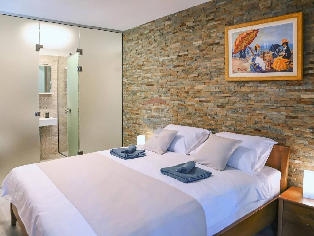 On the second floor there is a second apartment consisting of three bedrooms, i.e. master bedroom with its own bathroom, two bedrooms, two bathrooms, kitchen and dining room and terrace overlooking the sea and Učka.