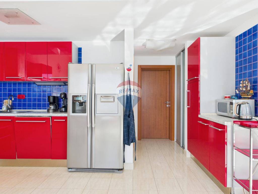 The apartment consists of a spacious living room connected to the dining area and a modern, fully equipped kitchen, four bedrooms in total, two bathrooms and a storage room.