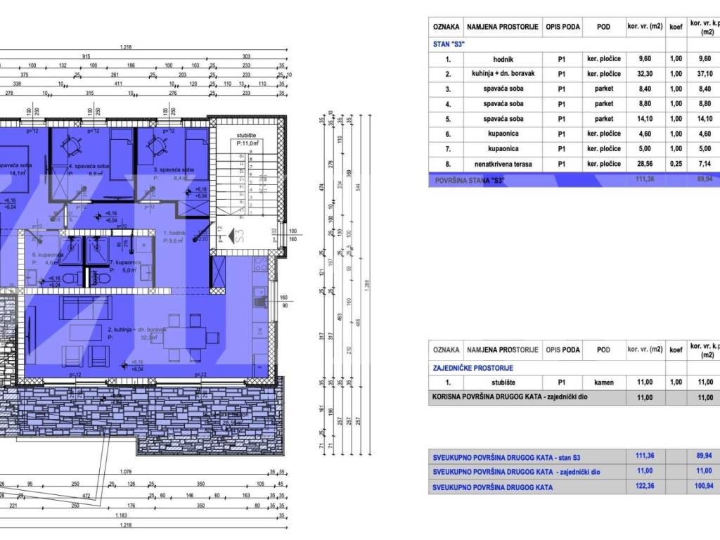 S ukupnom neto površinom od 124,58m2, ovaj stan, orijentiran prema jugu, nudi vrhunski životni prostor.