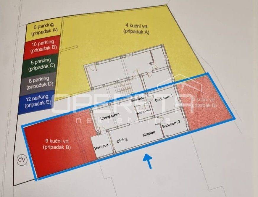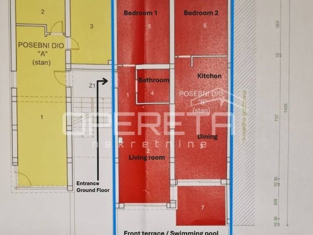 With a total of 75 m², it features a spacious kitchen connected to the dining and living area, oriented southwest for ample natural light and pleasant views of the pool. The two bedrooms are positioned at the rear of the property, each with access to the private garden.