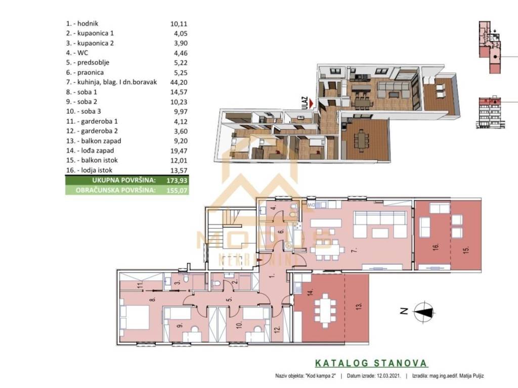 It consists of an interior space and a loggia with a total area of ​​173.93 m2 (calculated: 155.07 m2).
