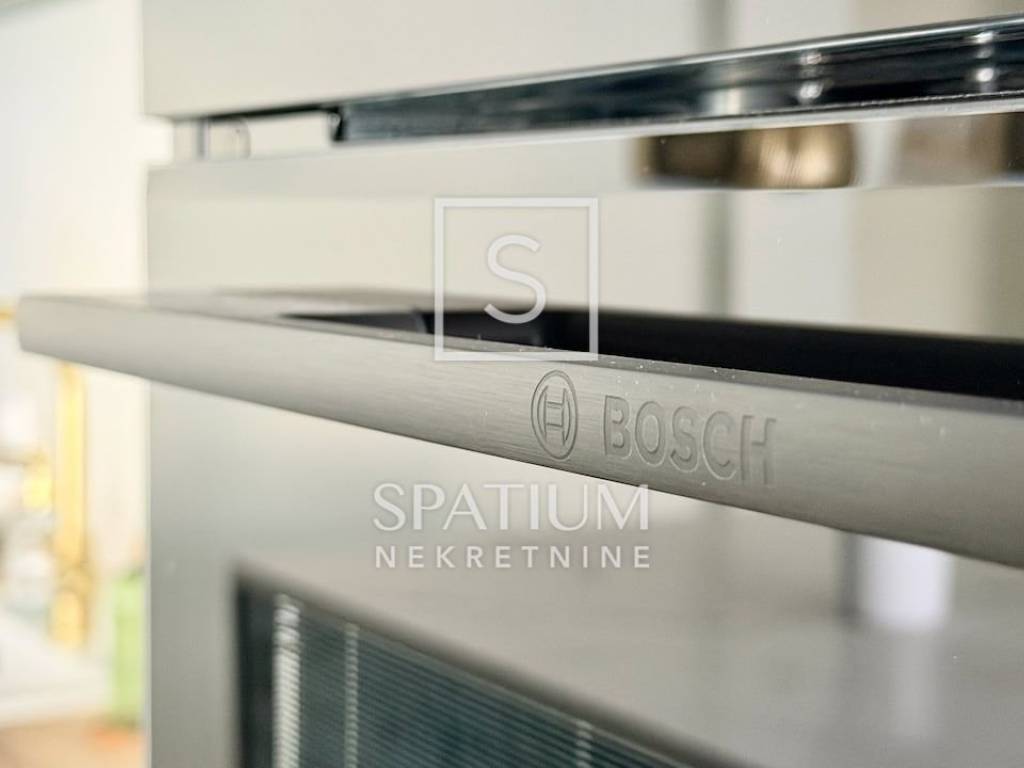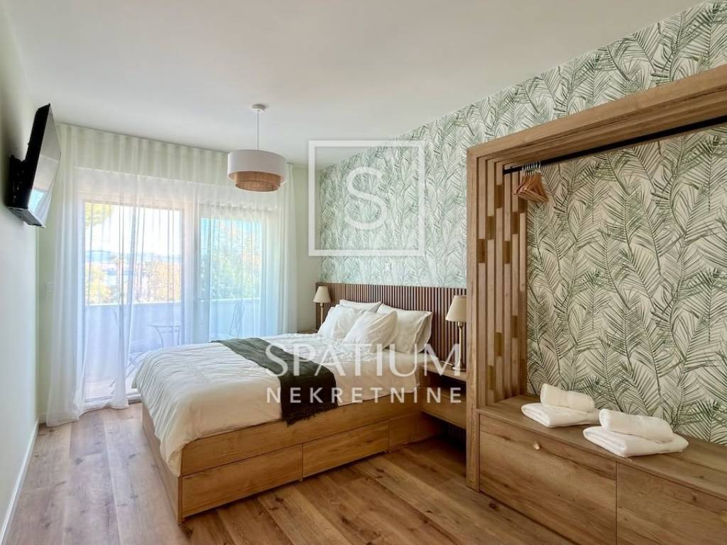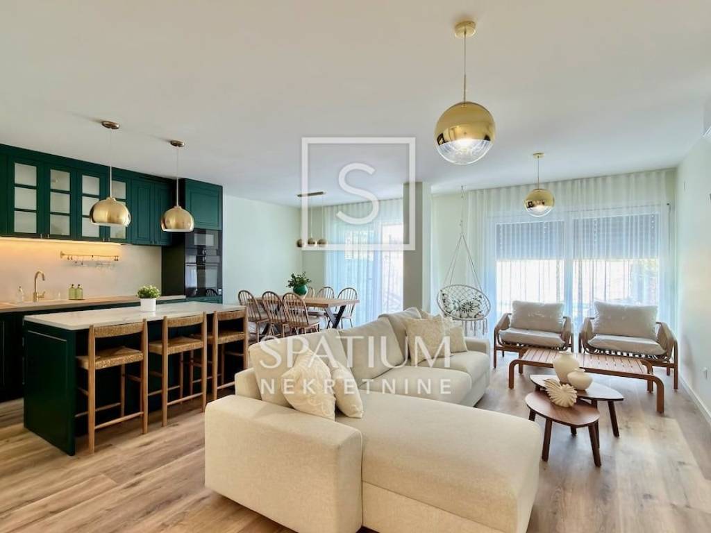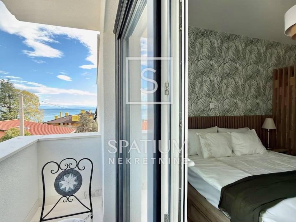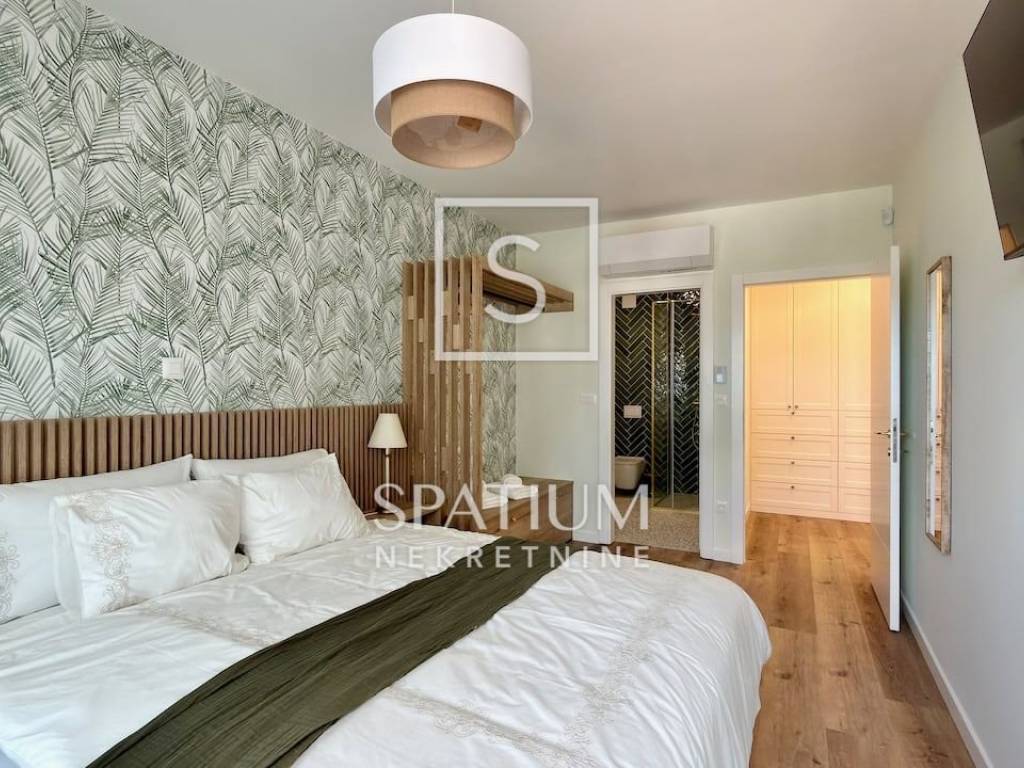 LOVRAN, we offer a well-furnished and equipped two-story two-bedroom apartment with a swimming pool in a new building within walking distance of the first beach and the old town of Lovran. On the ground floor there is the main living room that divides the function of the kitchen, dining room and living room from which there is an exit to the terrace with a swimming pool. Next to the internal staircase there is a guest toilet. On the first floor there are two bedrooms with private bathrooms for complete comfort. The master bedroom has a balcony with a partial sea view. The property is characterized by an excellent floor plan, quality custom-made furniture and stylish design solutions. The apartment has three outdoor parking spaces, and there is an additional parking space nearby.