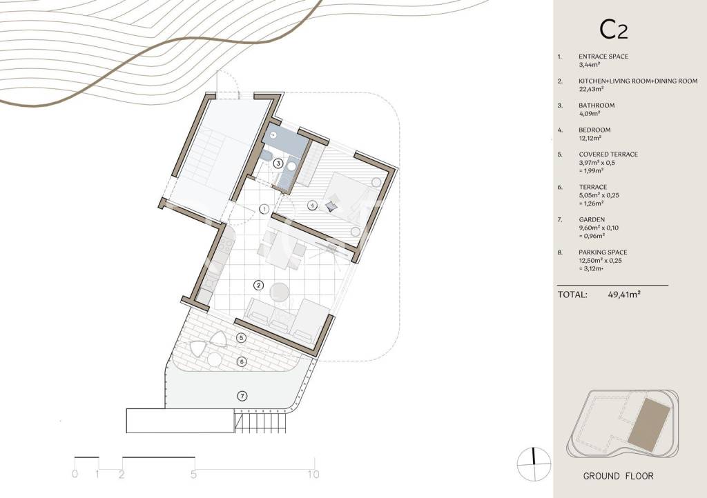 This two-room apartment with a total area of 48.78 m² is located within the contemporary VALI project in Rogoznica, a place known for its peaceful Mediterranean environment and proximity to the sea. It is an ideal choice for couples, individuals, or as an investment property with high rental potential. The apartment consists of a living room with a kitchen and dining area of 21.94 m², a bedroom of 11.57 m², and a modernly furnished bathroom of 4.14 m². The layout is functional and bright, with an emphasis on comfort and ease of daily living. The apartment features a covered terrace of 1.95 m² and an additional terrace of 1.91 m², ideal for relaxing outdoors, while a garden of 0.71 m² provides an extra dose of privacy and Mediterranean charm. A parking space of 3.12 m² is also included in the price. The combination of thoughtful design, quality construction, and a peaceful location makes this apartment in the VALI project an excellent choice for a comfortable life by the sea or a smart investment in the future. For more information, feel free to contact us.