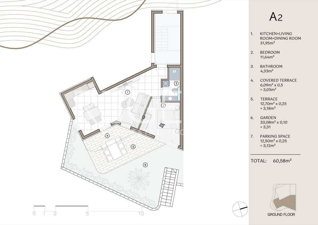 This two-bedroom apartment with a total area of 60.19 m² is located within the luxurious VALI project in Rogoznica, in a quiet part of the town known for its blend of modern living and Mediterranean tranquility. It is an ideal solution for families, couples, or investors looking for a quality, functional space close to the sea. The apartment consists of an open living room with a kitchen and dining area of 30.76 m², a bedroom of 12.15 m², and an elegantly designed bathroom of 3.72 m². The space is designed to provide a feeling of airiness and comfort, with plenty of natural light and connection to outdoor areas. The apartment is particularly valuable due to its covered terrace of 3.05 m², an additional terrace of 3.18 m², and a garden of 4.21 m², perfect for relaxing and enjoying the Mediterranean environment. A parking space of 3.12 m² is also included in the price. Top-quality materials and energy-efficient systems have been used, ensuring long-term quality, comfort, and aesthetic value of the home. The apartment in the VALI project represents a perfect blend of modern design, functionality, and proximity to the sea.