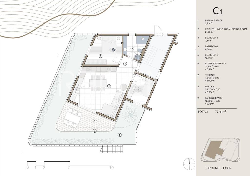 This three-room apartment with a total area of 76.17 m² is located within the modern VALI project in Rogoznica, in a quiet part of the town that offers a perfect blend of comfort, privacy, and proximity to the sea. It is an ideal solution for family life, vacation, or as an investment opportunity on the Adriatic coast. The apartment consists of a spacious living room with a kitchen and dining area of 30.82 m², two bedrooms, a modernly designed bathroom, and a functional entrance area. Each part of the interior is designed to ensure maximum comfort, good connectivity between rooms, and an abundance of natural light. A special advantage of the apartment is the two terraces – a covered one of 5.99 m² and an additional terrace of 1.82 m² – and a private garden of 5.18 m² which creates a sense of space and connection with nature. The price includes a parking space of 3.12 m². Quality construction, energy-efficient systems, and contemporary design make this apartment in the VALI project an excellent choice for those who want a modern, comfortable, and lasting home near the sea. For more information, feel free to contact us.