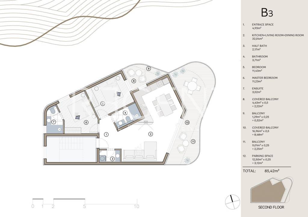 This three-room apartment with a total area of 85.33 m² is located within the contemporary VALI project in Rogoznica, which combines modern design, functionality, and Mediterranean elegance. It is an ideal solution for families, couples, or buyers seeking a quiet yet quality home in close proximity to the sea. The apartment consists of a spacious living room with a kitchen and dining area of 31.71 m², two bedrooms – the main one with its own bathroom of 3.86 m² – and an additional bathroom and toilet. The space is designed with an emphasis on comfort, natural light, and ease of movement through the open floor plan. A special value to the apartment is provided by as many as four outdoor areas – two covered and two open terraces – with a total area of more than 13 m², which offer a perfect place to relax and enjoy the view of the surroundings. The apartment also includes a parking space of 3.12 m². Quality materials, energy-efficient systems, and carefully selected details make this apartment in the VALI project a combination of aesthetics, comfort, and long-term value, perfect for living or investment on the Adriatic coast. For more information, feel free to contact us.