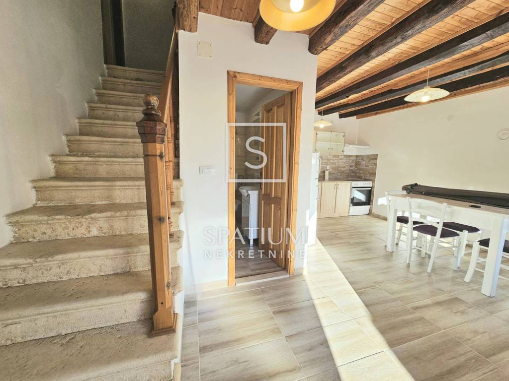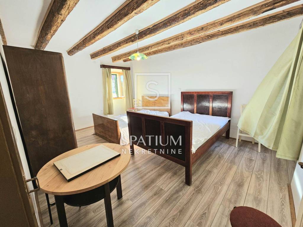 On the ground floor there is a spacious living room with a dining area, one bedroom, a kitchen and a bathroom. The staircase leads to the first floor where there are three more bedrooms and another toilet. In total, there is 85.5m2 of garden space on which there is a "šterna" (water tank) with a landscaped yard and a space for socializing as well as a landscaped parking lot for one vehicle.